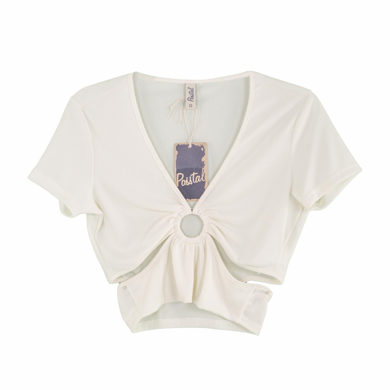 Camiseta de dama con cuello redondo y mangas cortas, estampado floral, color crudo, prenda de moda que realza la figura con diseños y texturas de alta calidad