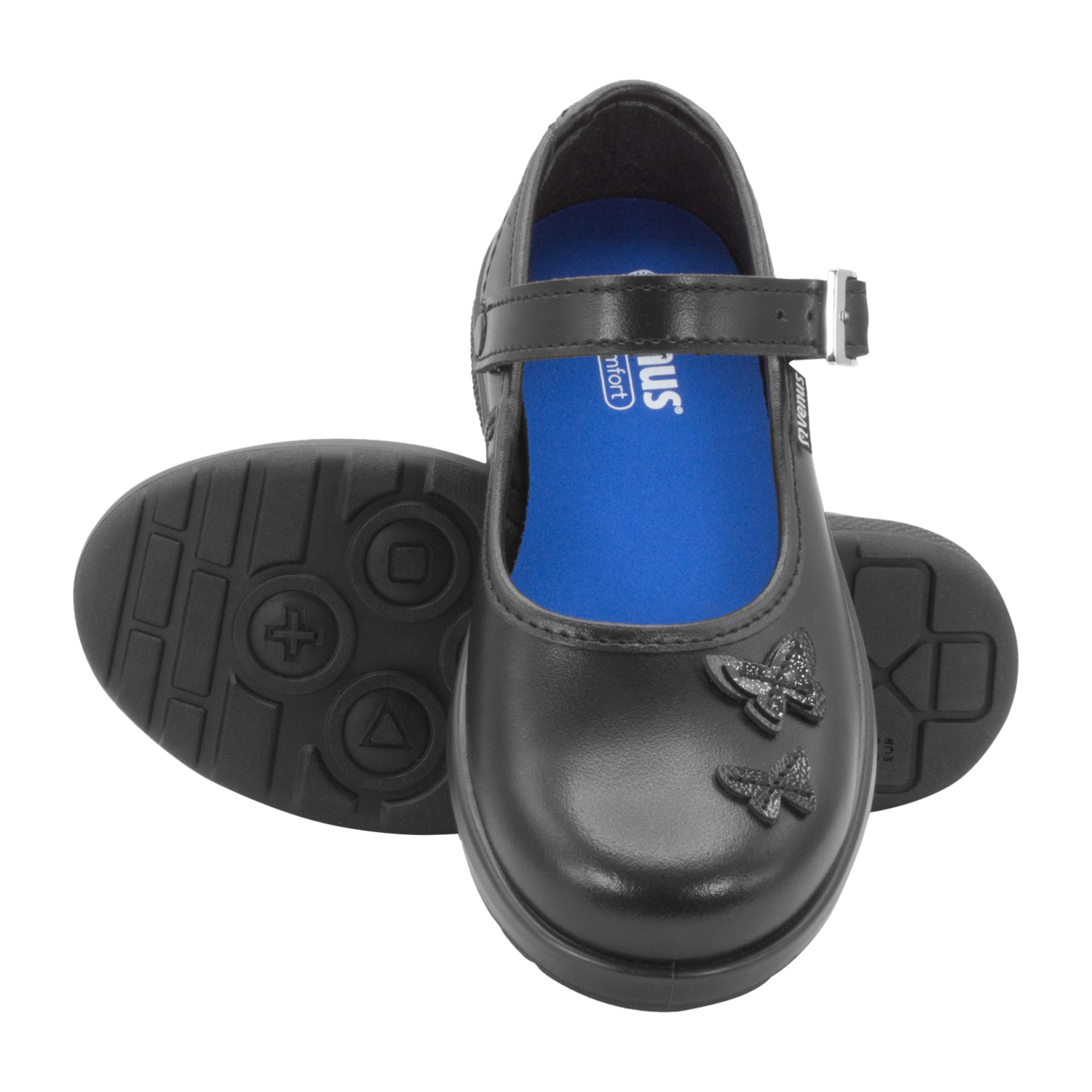 Zapatos para niña con diseño moderno y correa 2 en 1 de hebilla metálica ajustable para mayor seguridad. Detalle de aplique fijo de mariposas que encantará. 100% cuero, suave y durable.