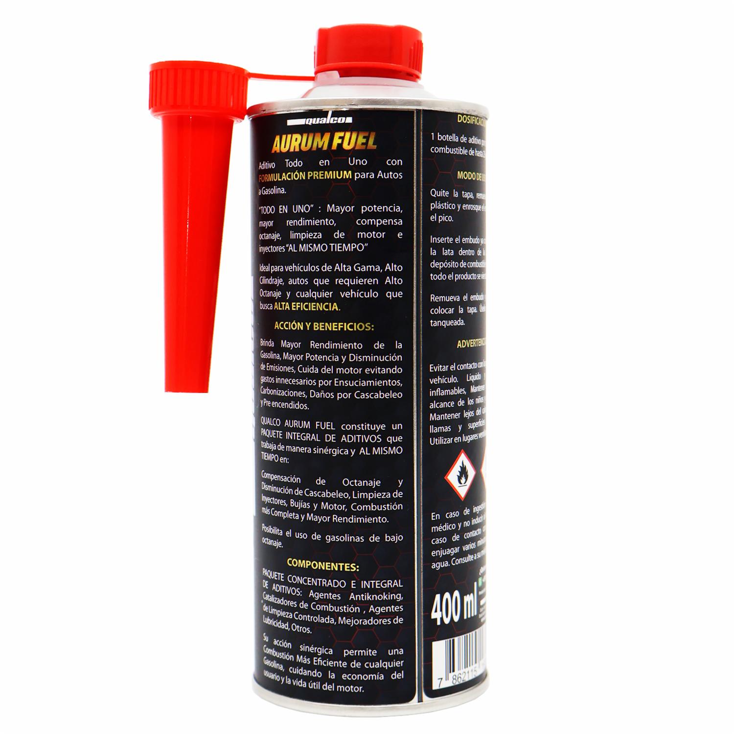 QUALCO AURUM FUEL es un aditivo de gasolina para vehículos de alta gama, ideal para vehículos de alto performance, alto cilindraje y autos que requieren alto octanaje. Compensación de octanaje y disminución de cascabeleo; limpieza de inyectores, bujías y motor; combustión más completa y mayor rendimiento. Incluye compuestos que actúan como solvente de lodo, gomas y resinas, inhibidores de corrosión y aumenta la velocidad de reacción