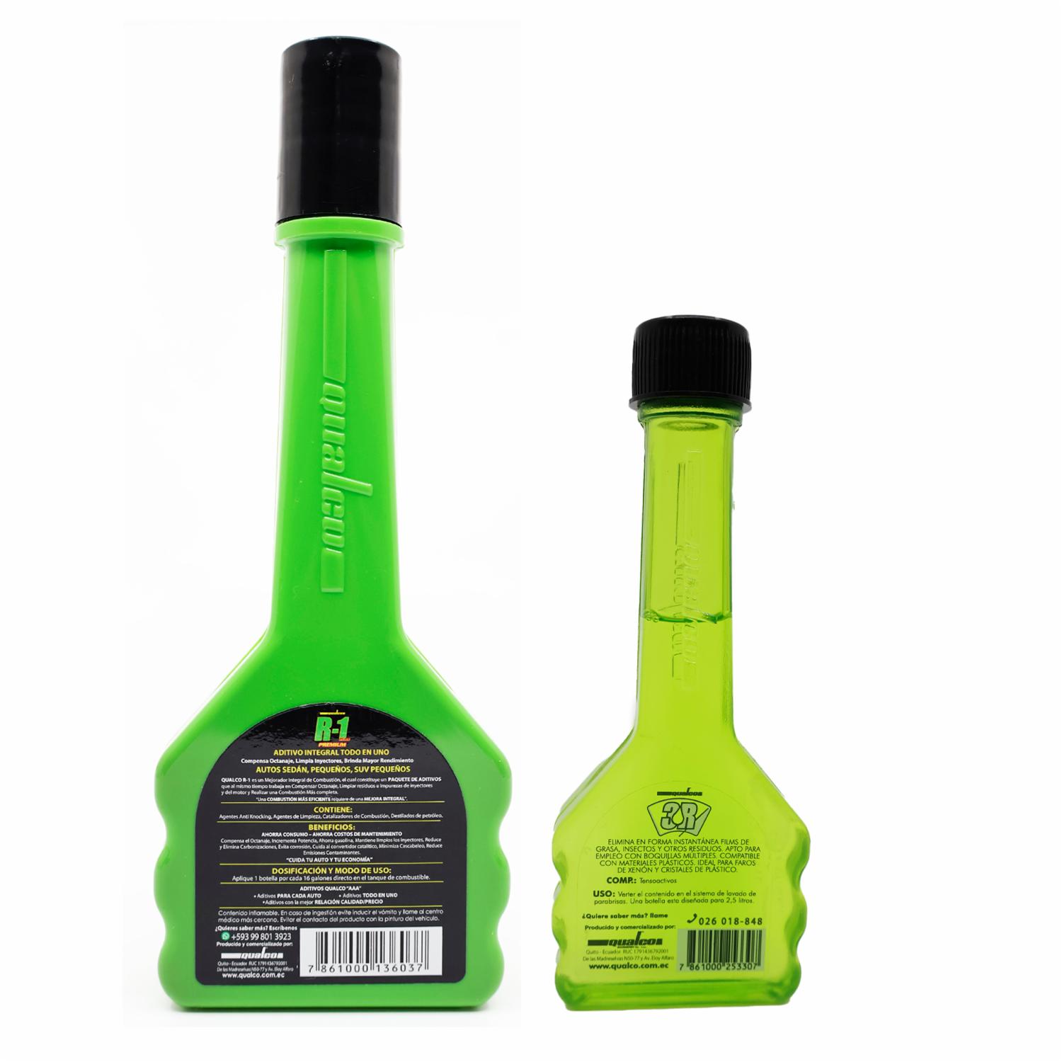 QUALCO R-1 PREMIUM: Aditivo para gasolina, para autos sedán, crossover y livianos. Aditivo todo en uno. Aumenta el rendimiento, ahorra combustible, incrementa la potencia, mantiene limpios los inyectores y línea de combustible, disminuye emisiones y evita el cascabeleo.QUALCO 3R LIMPIAPARABRISAS: para diluir en el agua de las plumas. De uso directo en el tanque de agua de plumas. Elimina restos de insectos, grasa, polvo y otras suciedades. Secado rápido. Dosificación hasta 2.5 litros de agua