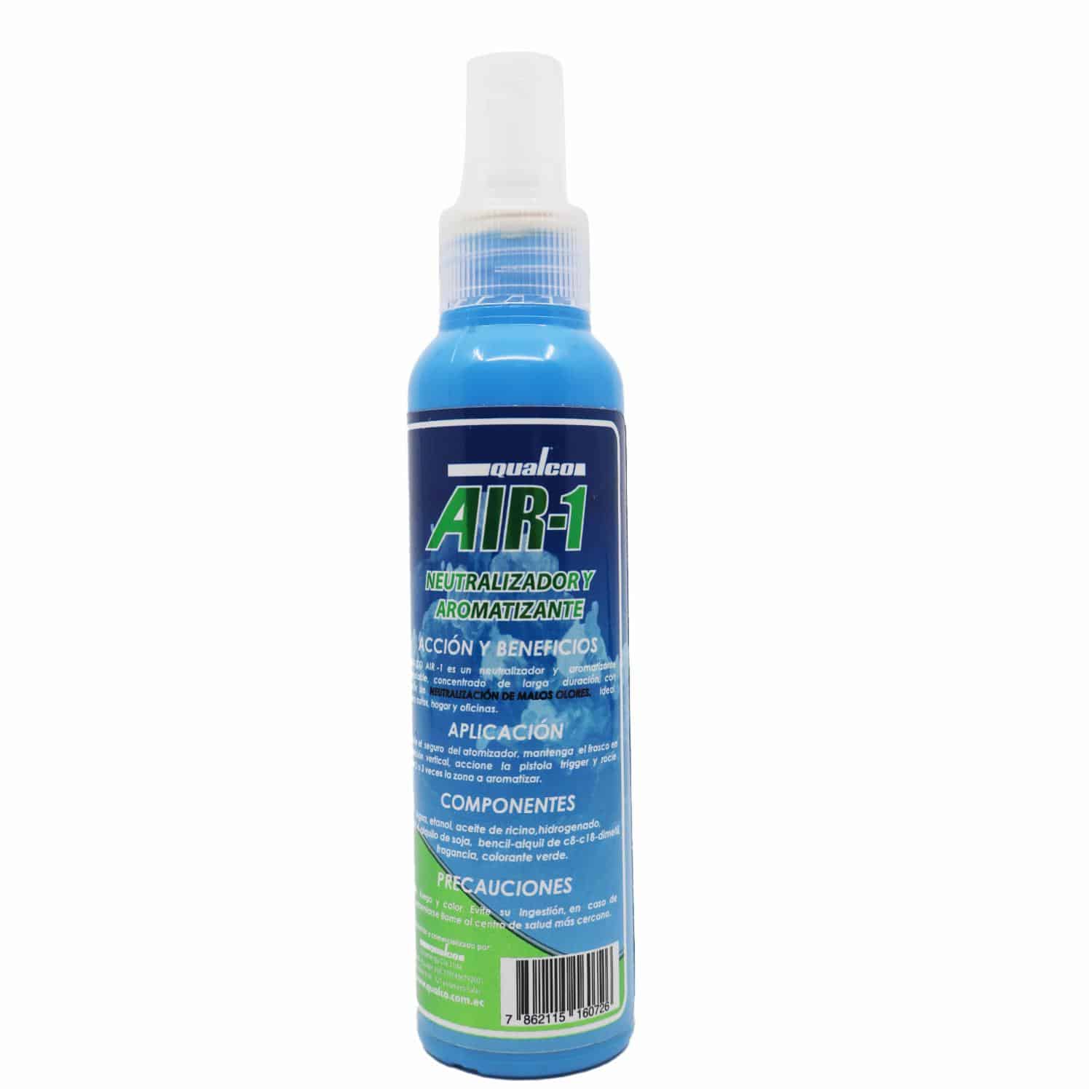 QUALCO AIR-1: Aromatizante y neutralizador de olores concentrado de larga duración, con poder de neutralización de malos olores en el ambiente causados por comida, tabaco, etc. Diseñado para ser usado en interiores de vehículos, oficinas, baños, habitaciones, salas, espacios abiertos y cerrados. Amigable con el medio ambiente