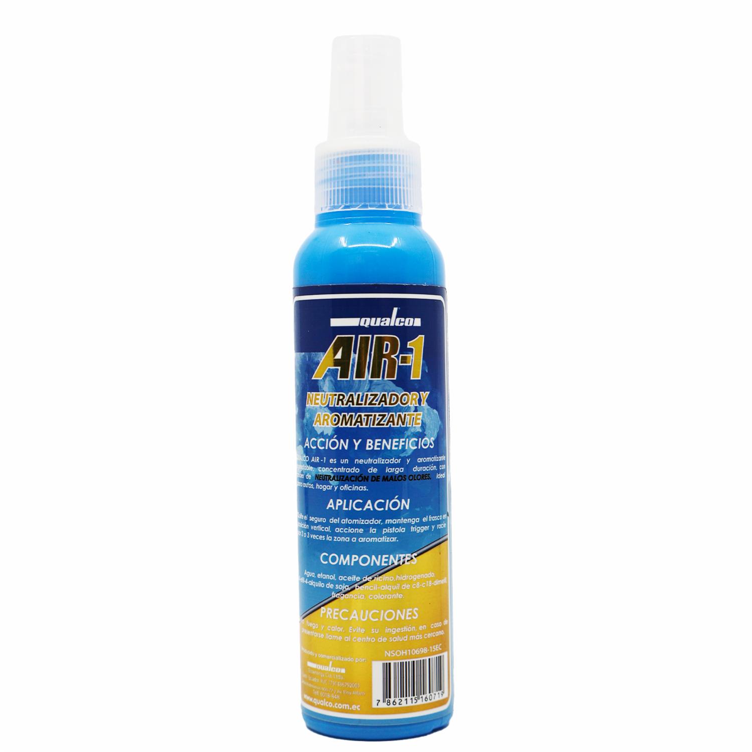 QUALCO AIR-1: Aromatizante y neutralizador de olores concentrado de larga duración, con poder de neutralización de malos olores en el ambiente causados por comida, tabaco, etc. Diseñado para ser usado en interiores de vehículos, oficinas, baños, habitaciones, salas, espacios abiertos y cerrados. Amigable con el medio ambiente
