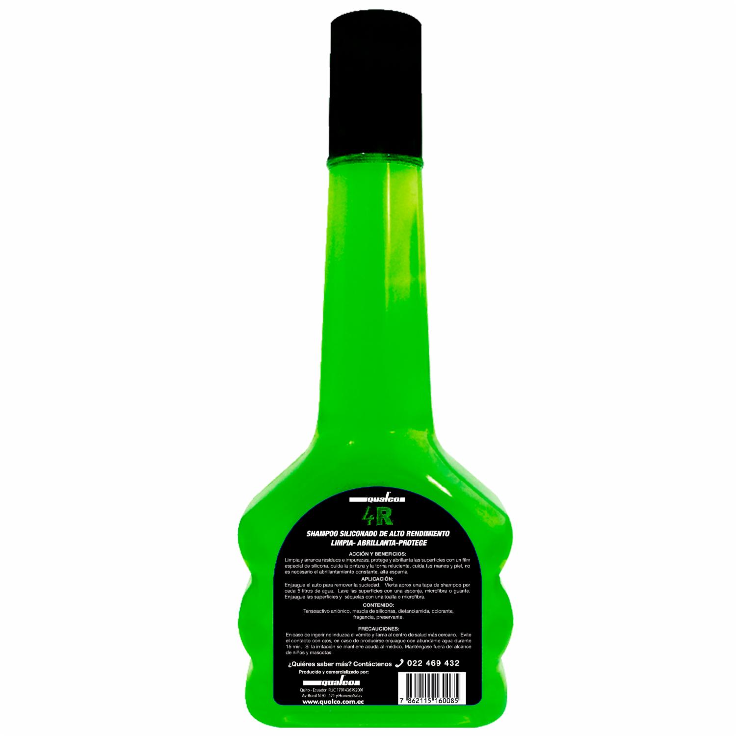 4R QUALCO: shampoo siliconado, cuya mezcla de siliconas forman una película protectora, brindando brillo duradero inmediato. No se requiere sacar brillo. Este producto incluye en su formulación ingredientes que cuidan las manos y la piel