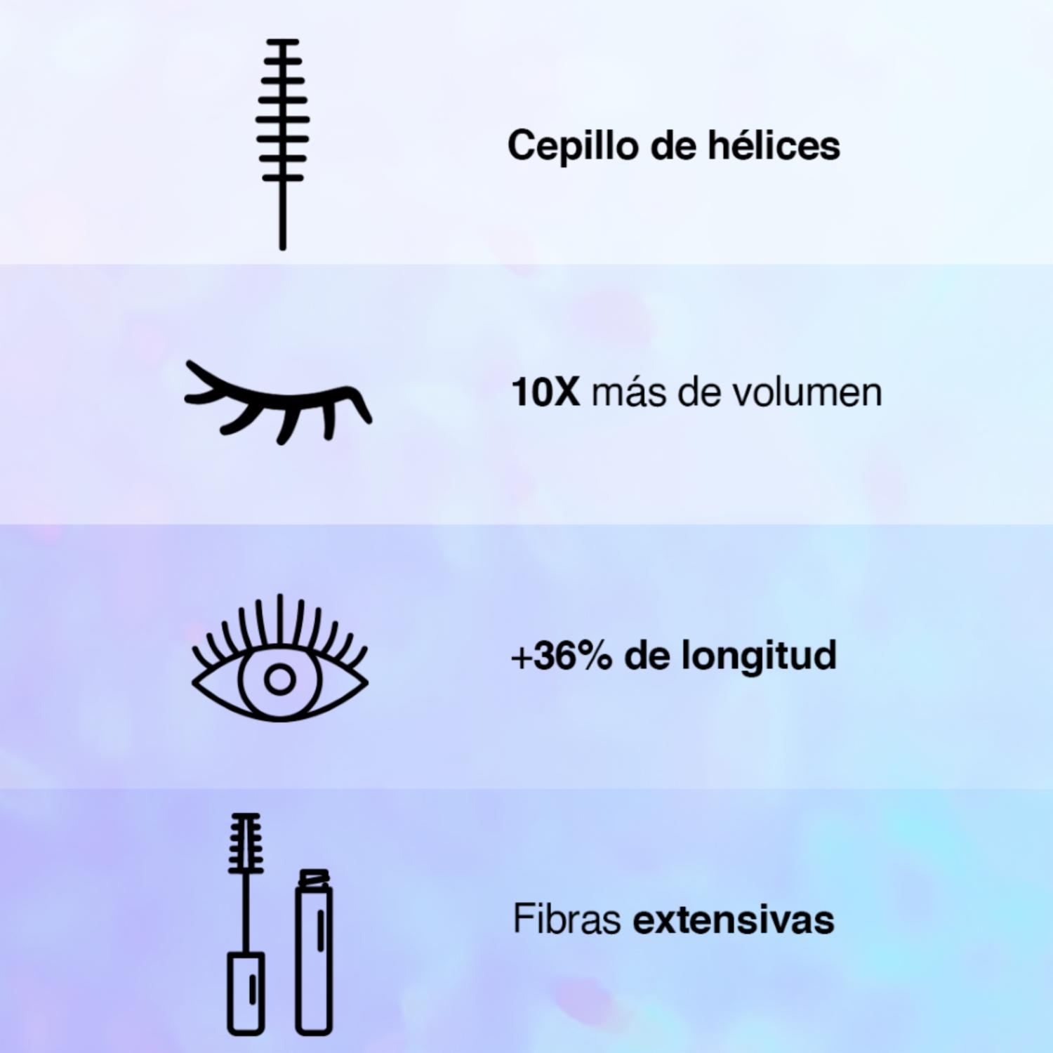Máscara de pestañas Falsies Surreal Extensions alarga la realidad de tus pestañas con un +36 % de longitud y un impacto surrealista con un volumen 10X. -Desliza el megacepillo de la raíz a la punta de las pestañas para crear volumen al instante. -No dejes que la mascara se seque entre las capas. -Se quita con el desmaquillador de ojos