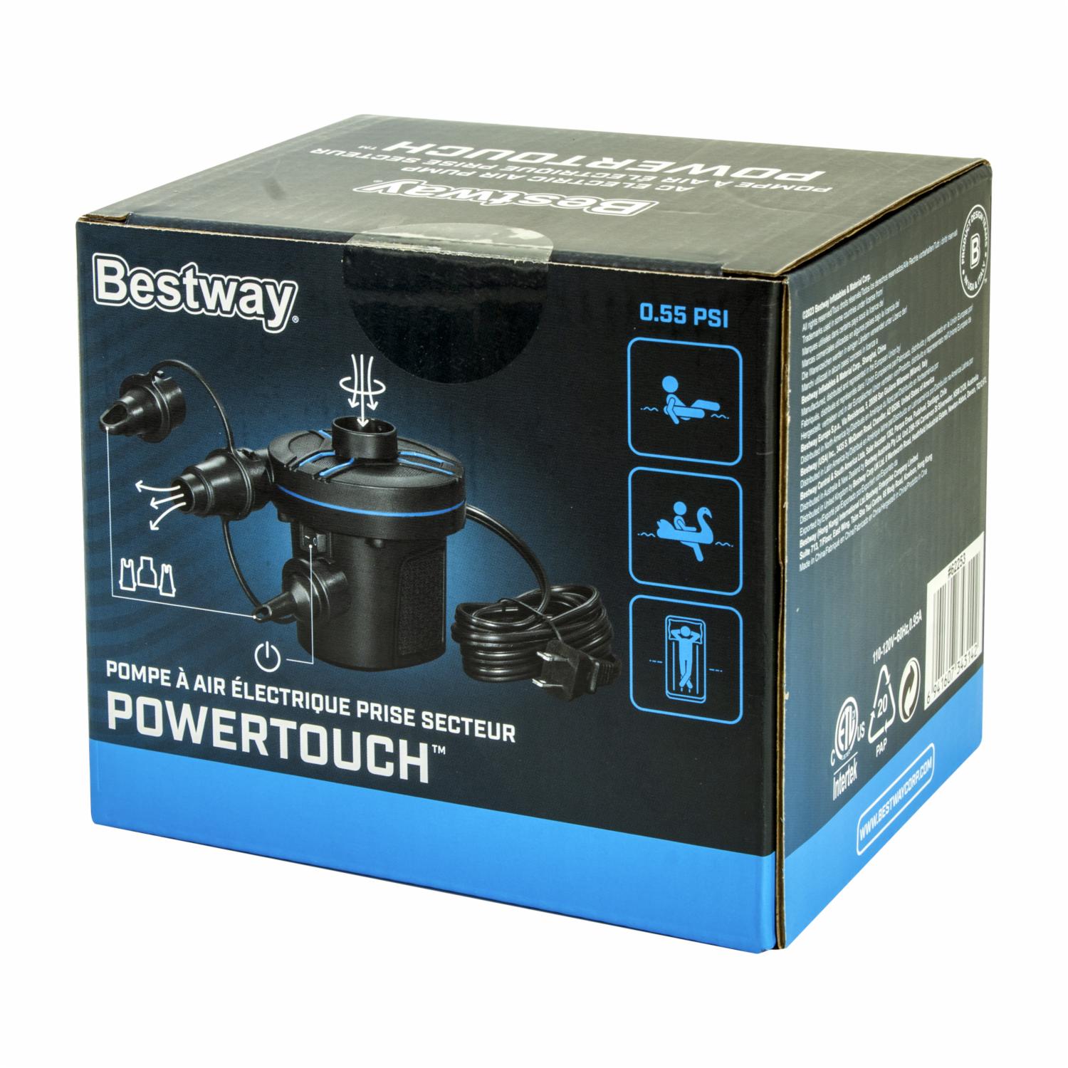 • La Bomba de Aire Eléctrica Power Touch Bestway con una presión de 0,55 Psi es una excelente opción para inflar y desinflar productos inflables de manera rápida y eficiente