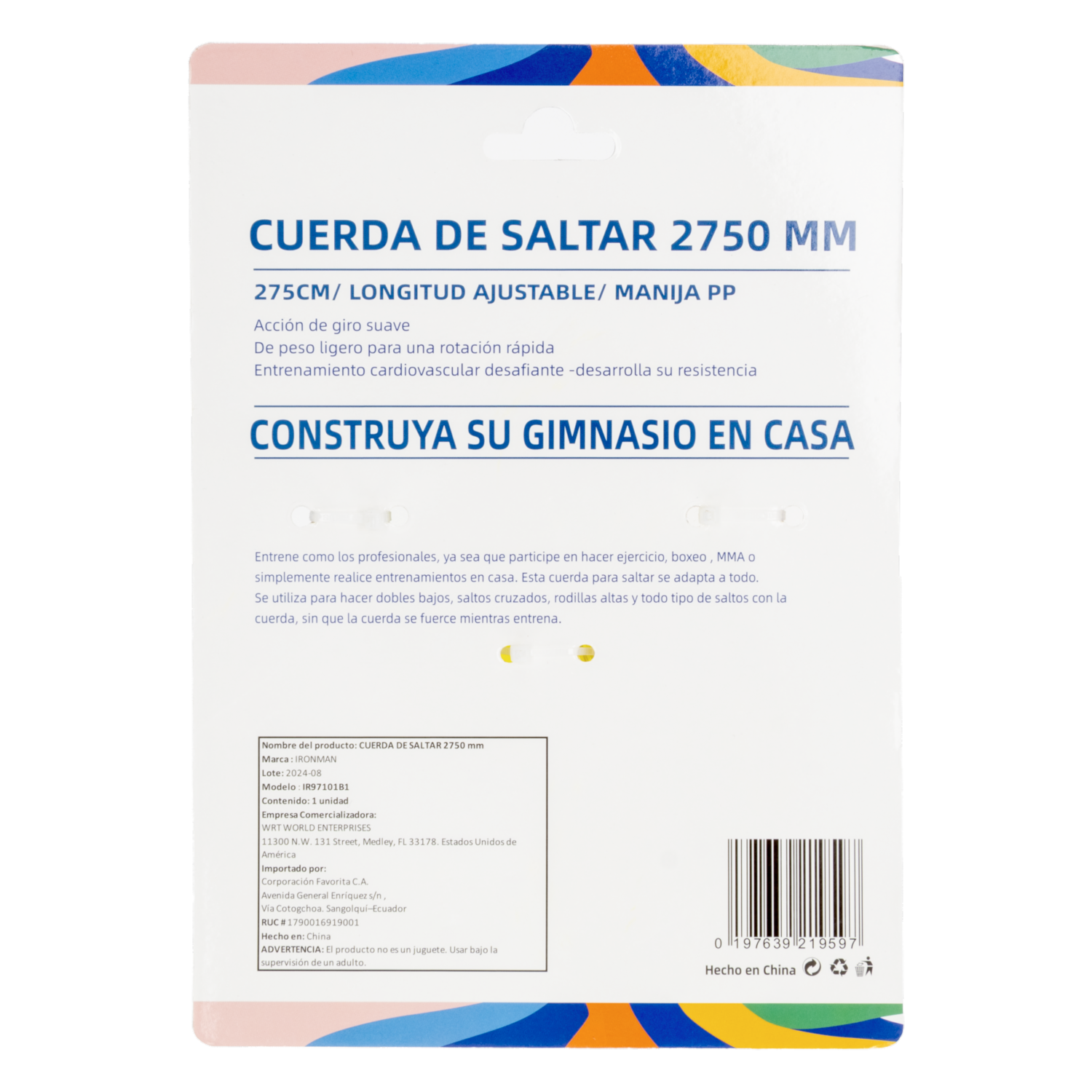 Mejora tu coordinación y resistencia con la cuerda plástica IRON MAN de 275cm. Ligera y resistente, es ideal para entrenamientos cardiovasculares, calentamientos y rutinas de salto en casa o al aire libre. ¡Entrena de forma divertida y efectiva!