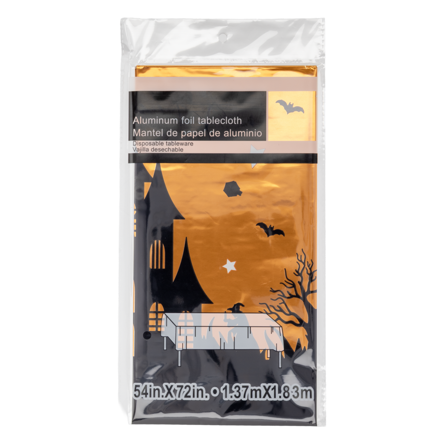 Dale un toque brillante y festivo a tu mesa con este mantel de aluminio decorado con motivos de Halloween. Resistente y fácil de limpiar, es perfecto para proteger tu superficie mientras ambientas tu fiesta con estilo y un toque espeluznante. ¡Haz que cada comida sea una celebración!