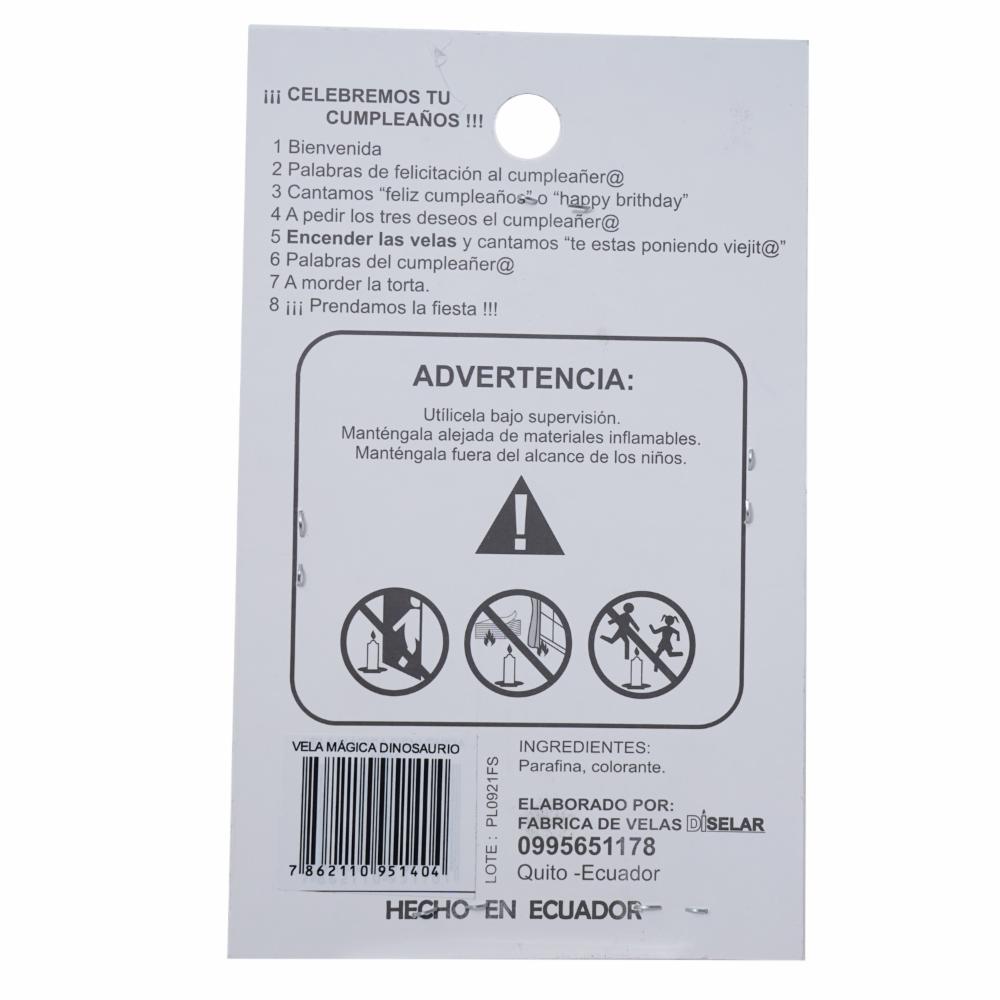 Vela Mágica Dinosaurio DISELAR 95 x 155 x 11 mm – DISELAR. Disponible en nuestros locales. Precio y stock pueden variar según la tienda.