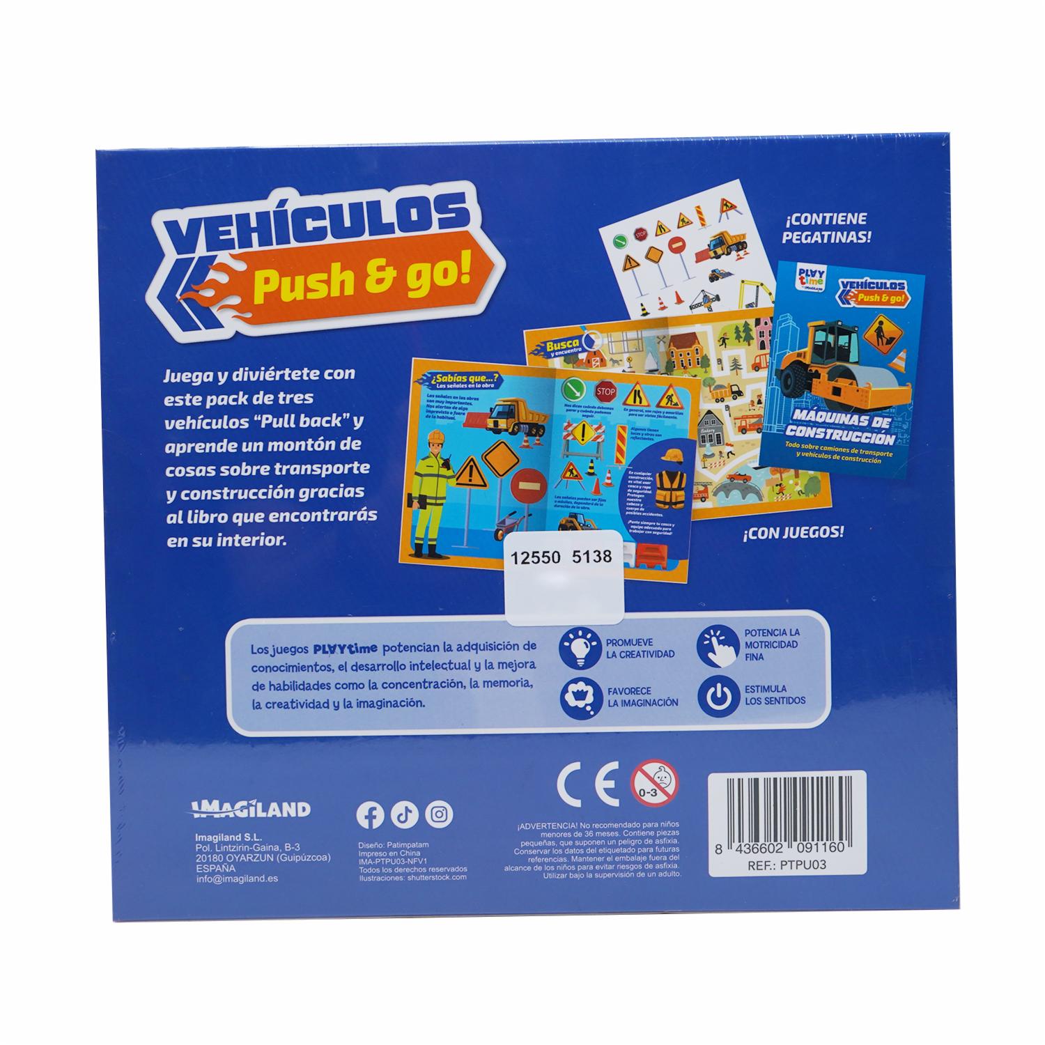 Juega y diviértete con este pack de tres vehículos "Pull back" y aprende un montón de cosas sobre transporte y construcción gracias al libro que encontrarás en su interior