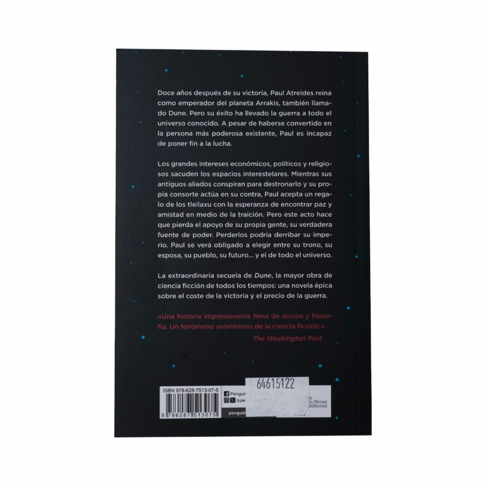• Y frente a ellos, los grandes intereses económicos, políticos y religiosos que sacuden los espacios interestelares: la CHOAM, la Cofradía espacial, el Landsraad, la Bene Gesserit... Todo ello, y mucho más, conforma esta segunda entrega de «Dune»: un fresco impresionante y una obra cumbre de la imaginación
