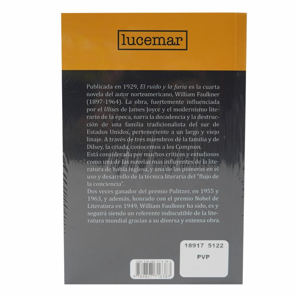 • Publicada en 1929, El ruido y la furia es la cuarta novela del autor norteamericano William Faulkner (1897-1964). La obra, influenciada por el Ulises de James Joyce y el modernismo literario de la época, narra la decadencia de una familia tradicionalista del sur de Estados Unidos, de un antiguo linaje