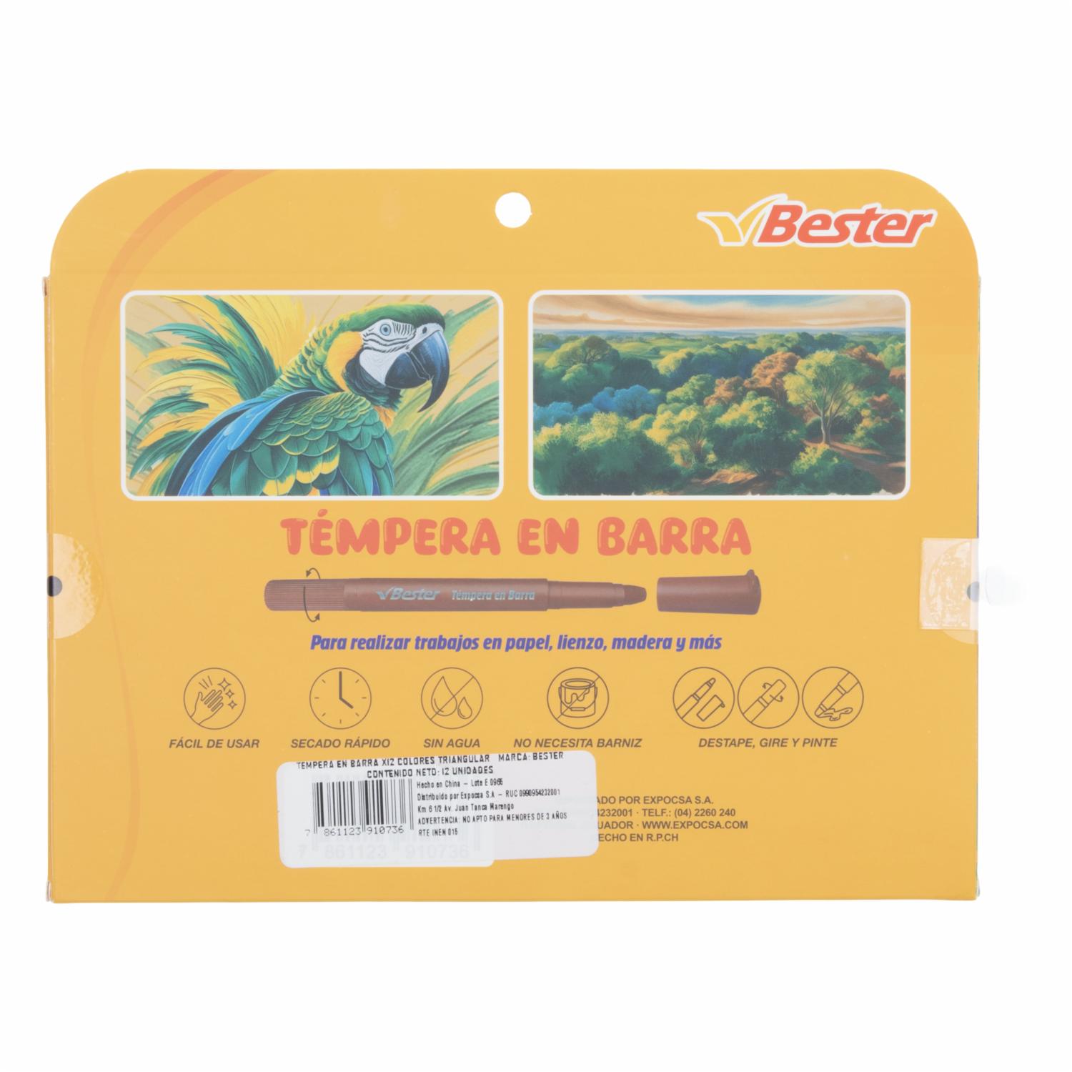 Témperas en Barra BESTER son fáciles de usar y perfectas para proyectos escolares y manualidades. Su fórmula permite aplicar colores vivos y uniformes sin ensuciar. Ideales para niños y artistas principiantes. Características - Fórmula lavable y no tóxica - Presentación en barra para aplicación sencilla - Colores vibrantes y opacos - Secado rápido - Envase plástico resistente