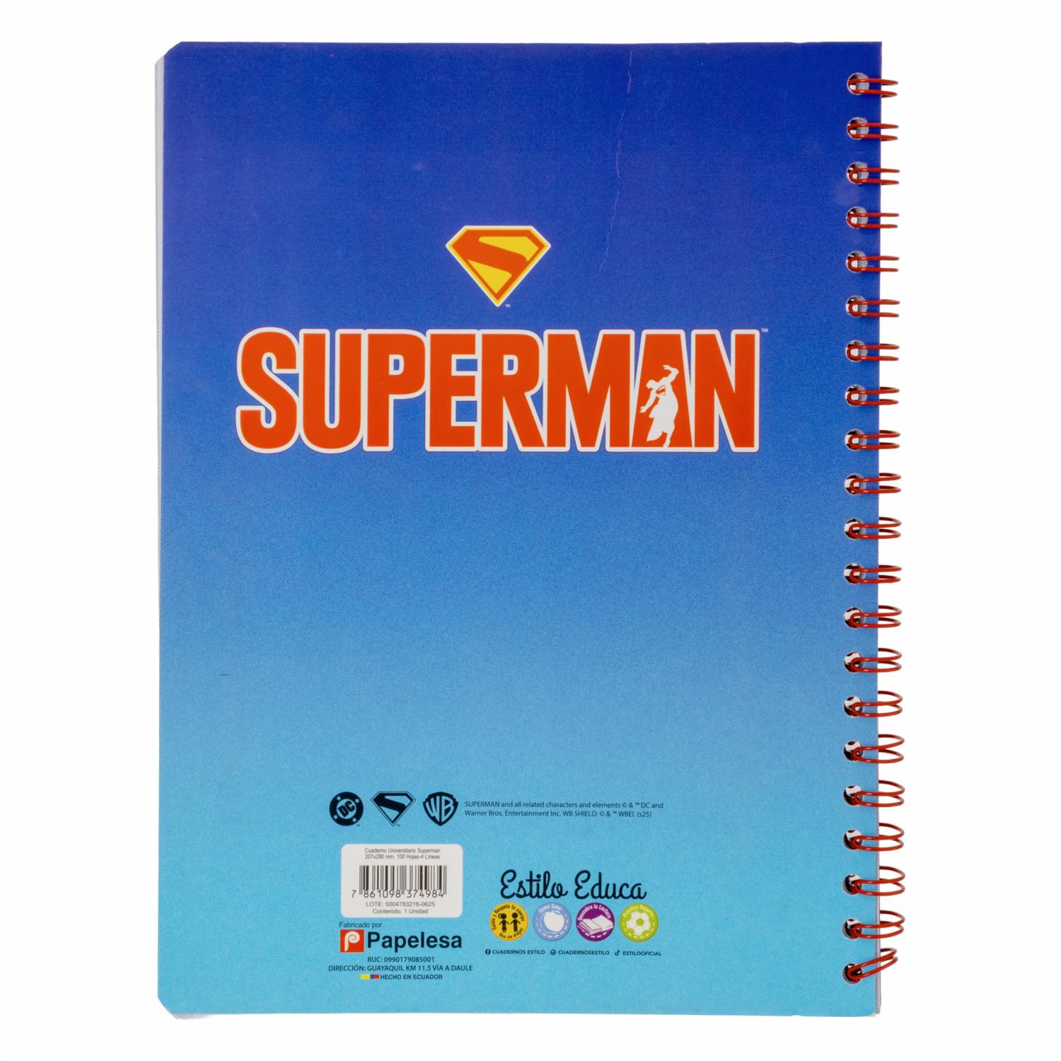 Cuaderno Universitario 4 Líneas Superman ESTILO 100 Hojas – ESTILO. Disponible en nuestros locales. Precio y stock pueden variar según la tienda.