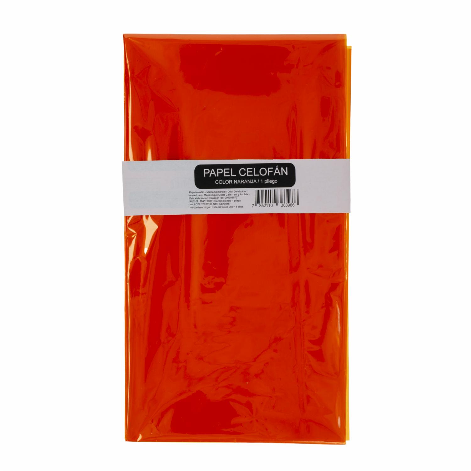 Características:. - Papel celofán de color naranja. - Se presenta en pliegos, es decir, en hojas individuales. - Es transparente y brillante. - Es resistente y flexible. Usos:. - Decoración de regalos y paquetes. - Manualidades y trabajos de artesanía. - Envolver alimentos y dulces. - Creación de adornos para fiestas y eventos. - Forrar libretas, cuadernos y agendas