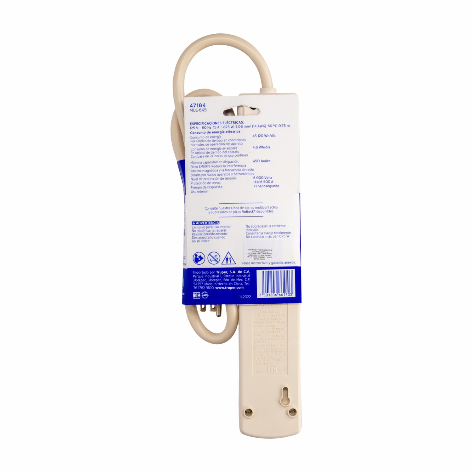 Con seis tomas de corriente, este cortapicos ofrece múltiples opciones de conexión y está diseñado para absorber hasta 450 julios, brindando una protección eficaz contra daños eléctricos