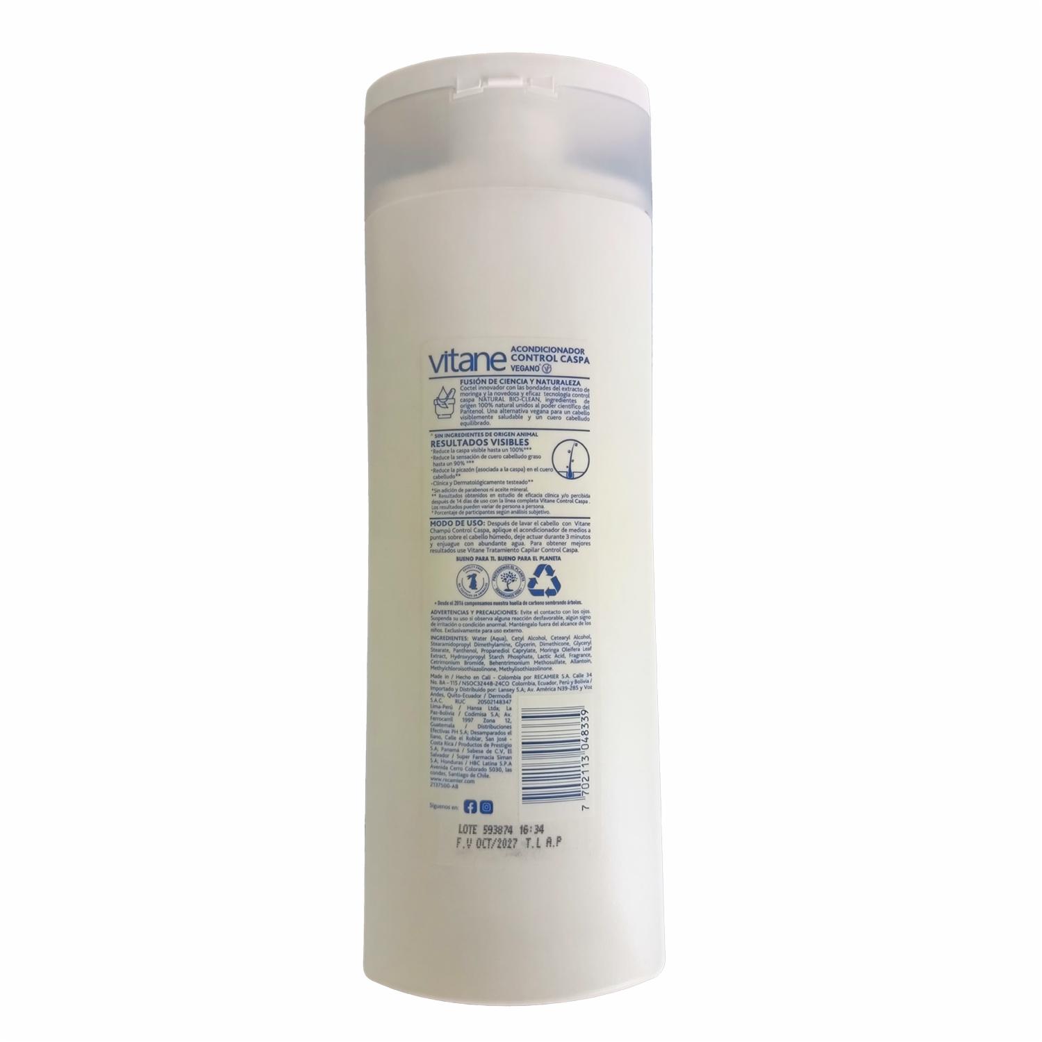 Vitane Acondicionador Control Caspa, es una fusión de ciencia y naturaleza te presenta su nueva alternativa vegana y sin sal para ayudarte al control de la caspa con su innovador ingrediente 100% de origen vegetal el Natural Bioclean. Modo de empleo: Aplica Vitane Acondicionador Control Caspa de medios a puntas sobre el cabello húmedo, deja actuar durante 3 minutos y enjuaga con abundante agua