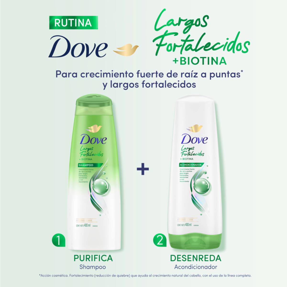 • Acondicionador Dove Largos Fortalcidos + Biotina, pelo brillante, con movimiento y fuerte de raíz a puntas