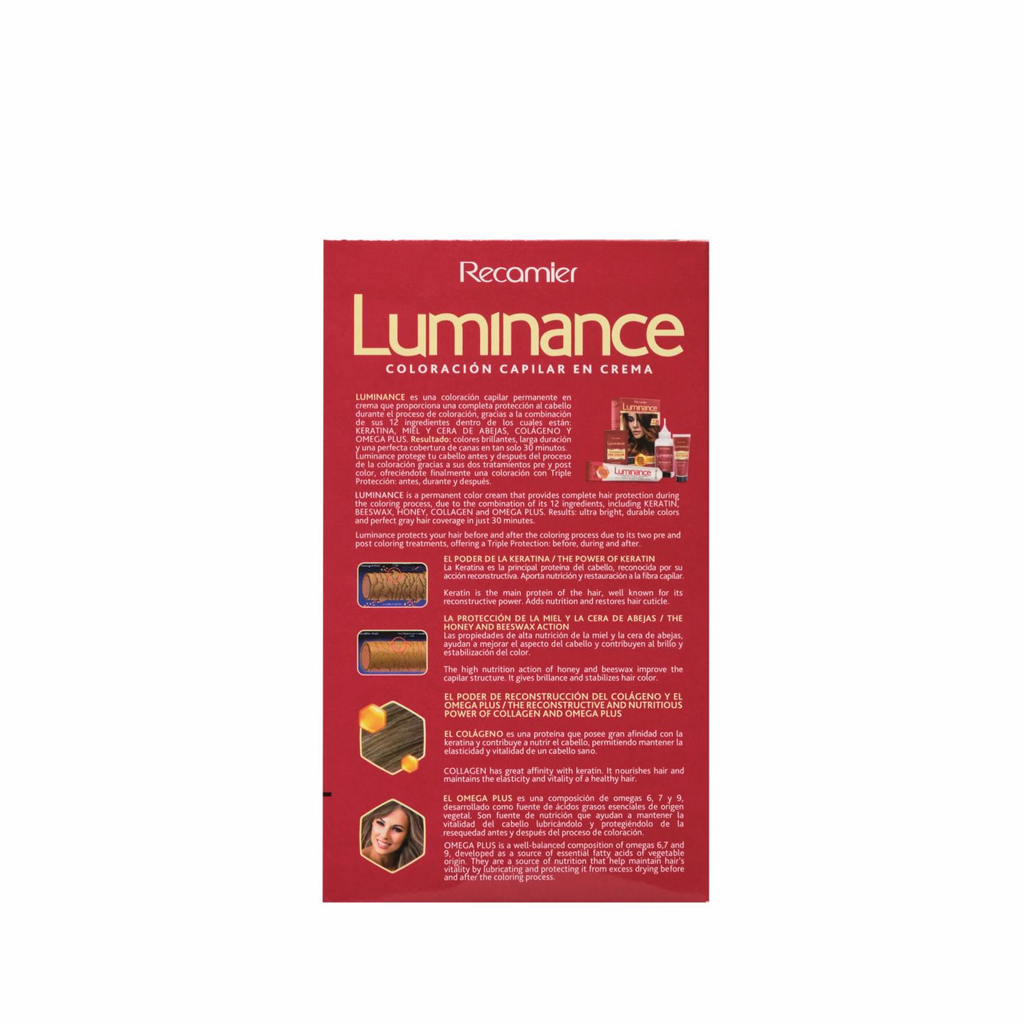 Luminance cuenta con el Sistema 3 Plus, que te acompañará en el proceso de coloración con triple protección gracias a sus dos tratamientos, pre-color y post-color. Su fórmula, con escudo protector, contiene ingredientes de origen natural como: la cera y la miel de abejas, la keratina, el colágeno y el omega plus. PRODUCTOS