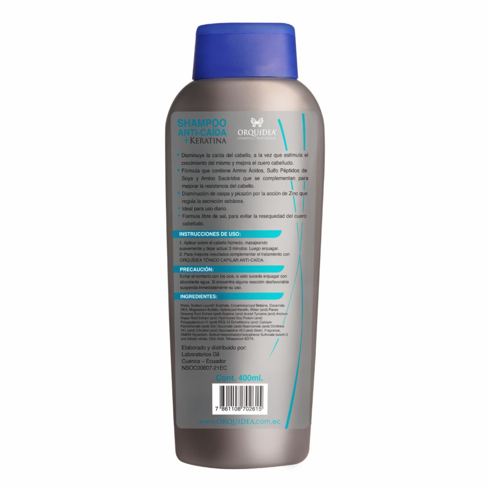 • ORQUÍDEA SHAMPOO ANTI-CAÍDA +KERATINA disminuye la caída y estimula el crecimiento del cabello. Control de caspa y secreción sebácea. Disminuye la caída del cabello, a la vez que estimula el crecimiento del mismo y mejora el cuero cabelludo