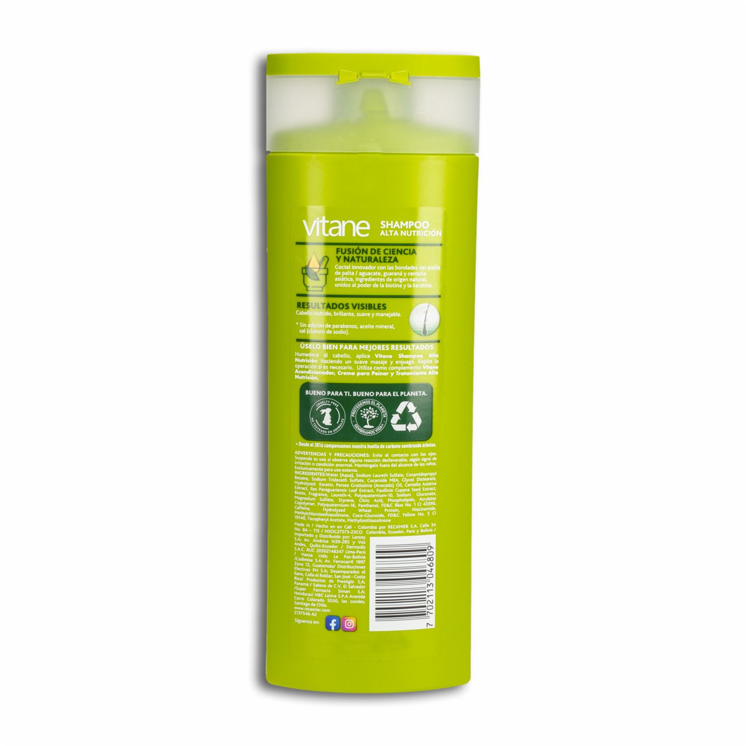 Revitaliza tu cabello con el Shampoo de Alta Nutrición de VITANE, presentado en un práctico envase de 400 ml. Este shampoo está diseñado para proporcionar una hidratación profunda y nutrir cada hebra de tu cabello