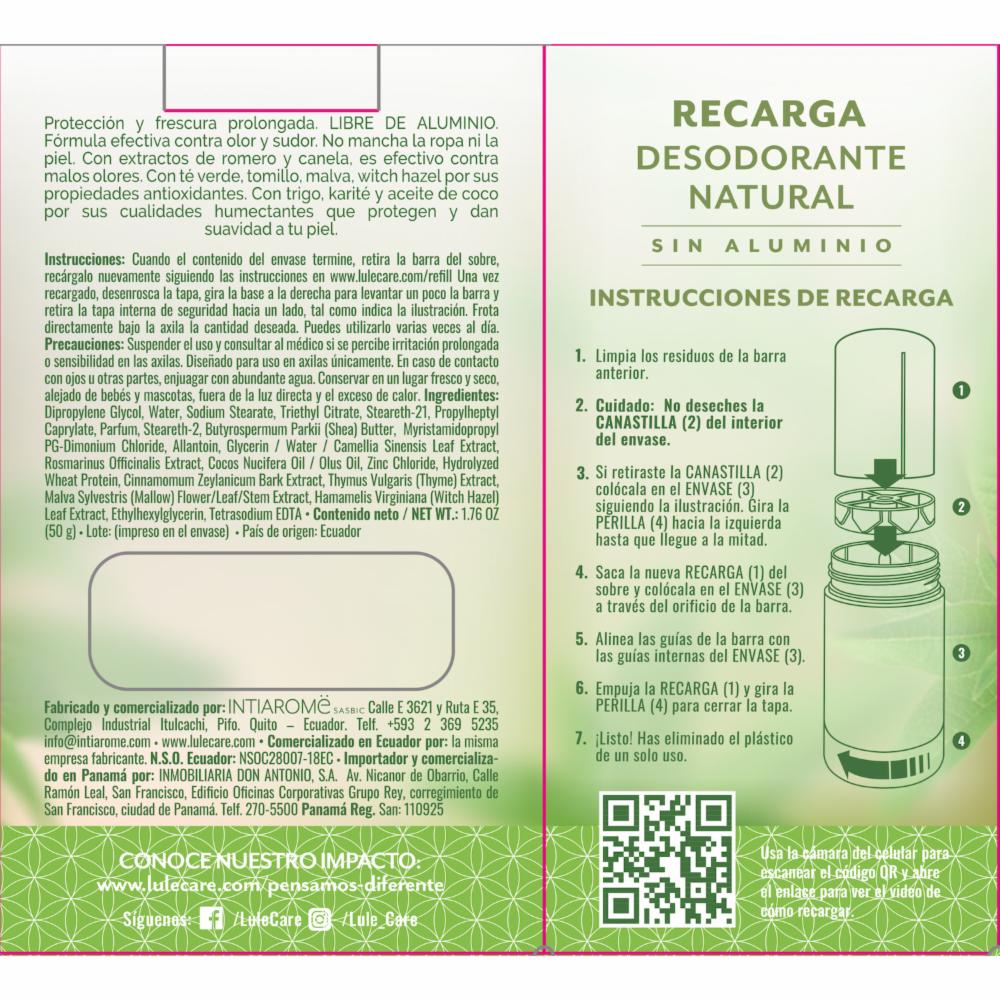 • Recarga para el Desodorante natural Lulë REFRESHING VERBENA, fragancia refrescante, cítrica, SIN ALUMINIO, triclosan y parabenos
