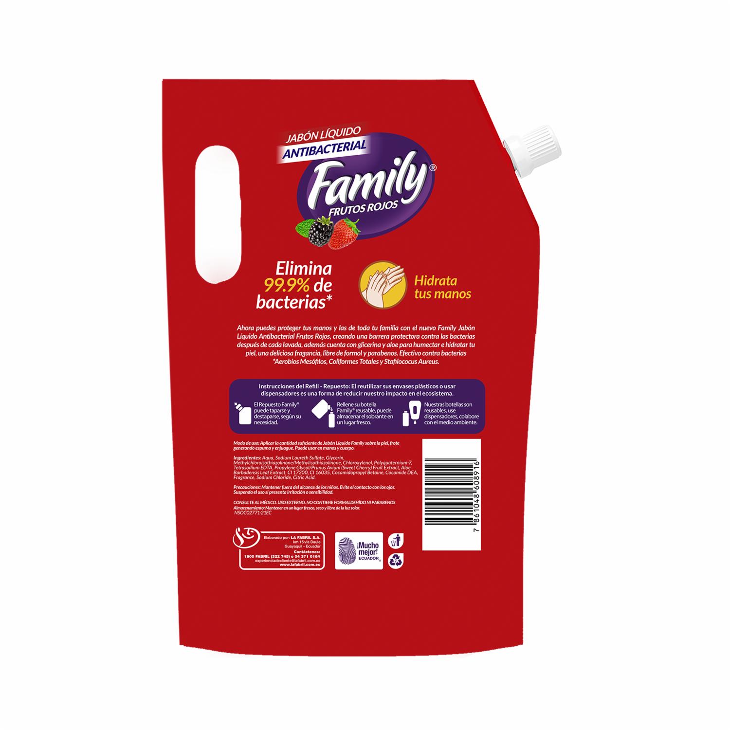 • El Nuevo Jabón Liquido Family Antibacterial Fragancia Frutos Rojos, Elimina El 99