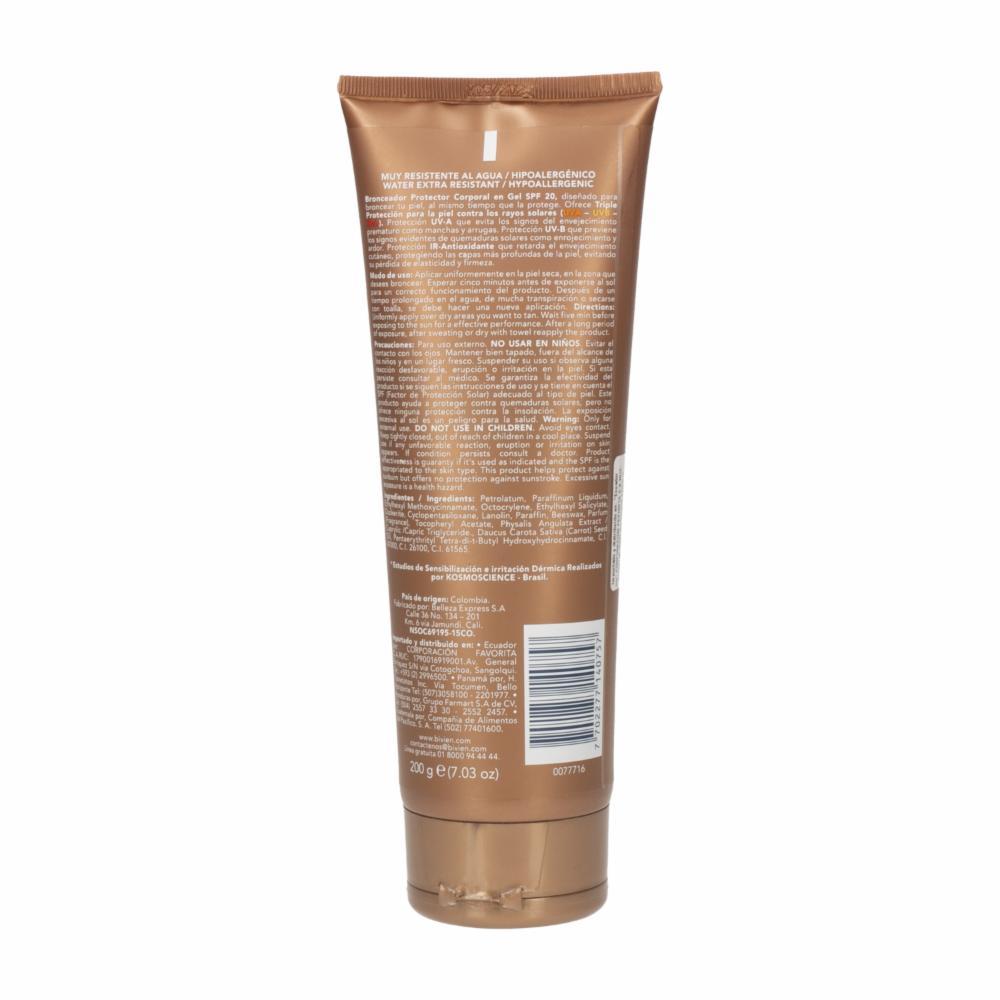 - Es un producto que combina bronceador y protector solar en gel,- Contiene un activador de melanina, lo que ayuda a acelerar el proceso de bronceado,- Tiene un factor de protección solar (SPF) de 20, lo que lo hace adecuado para exposiciones moderadas al sol,- Es hipoalergénico, lo que significa que es menos propenso a causar reacciones alérgicas en la piel,- Al ser en gel, se absorbe fácilmente y no deja una sensación grasosa en la piel