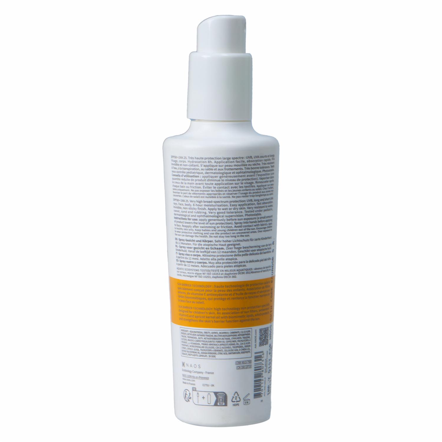 Protección solar muy alta para la piel delicada de niños, con tecnología SUN BARRIER para reforzar la barrera cutánea. Ofrece hidratación continua durante 8 horas y es resistente al agua, arena y sudor. Apta para pieles sensibles y atópicas a partir de los 12 meses