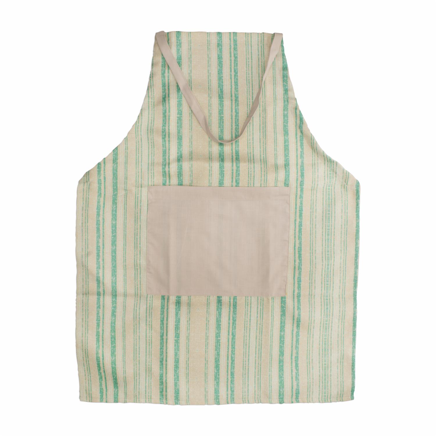 Este delantal combina estilo y funcionalidad con su diseño de rayas en color aqua y un práctico bolsillo frontal. Ideal para mantener tus herramientas de cocina al alcance mientras trabajas en tus recetas