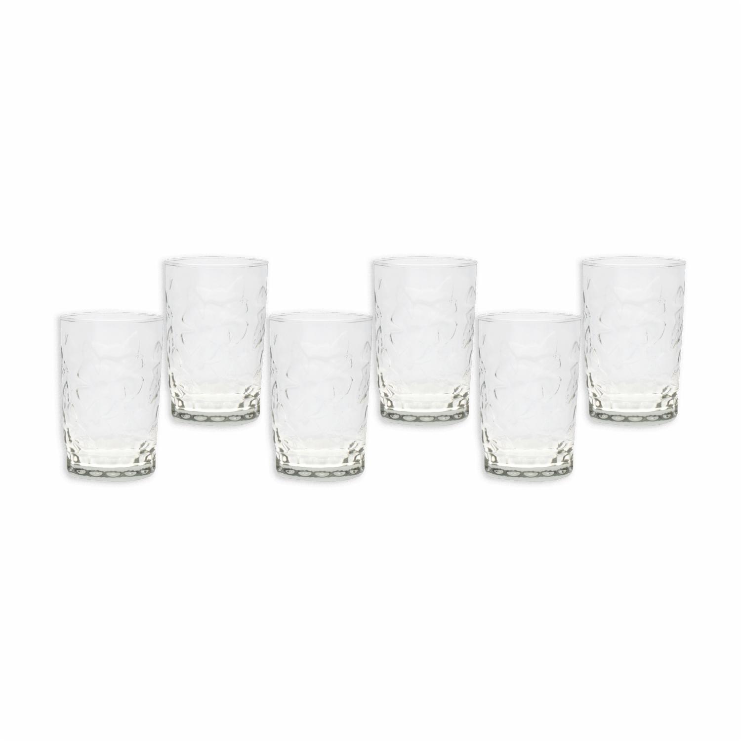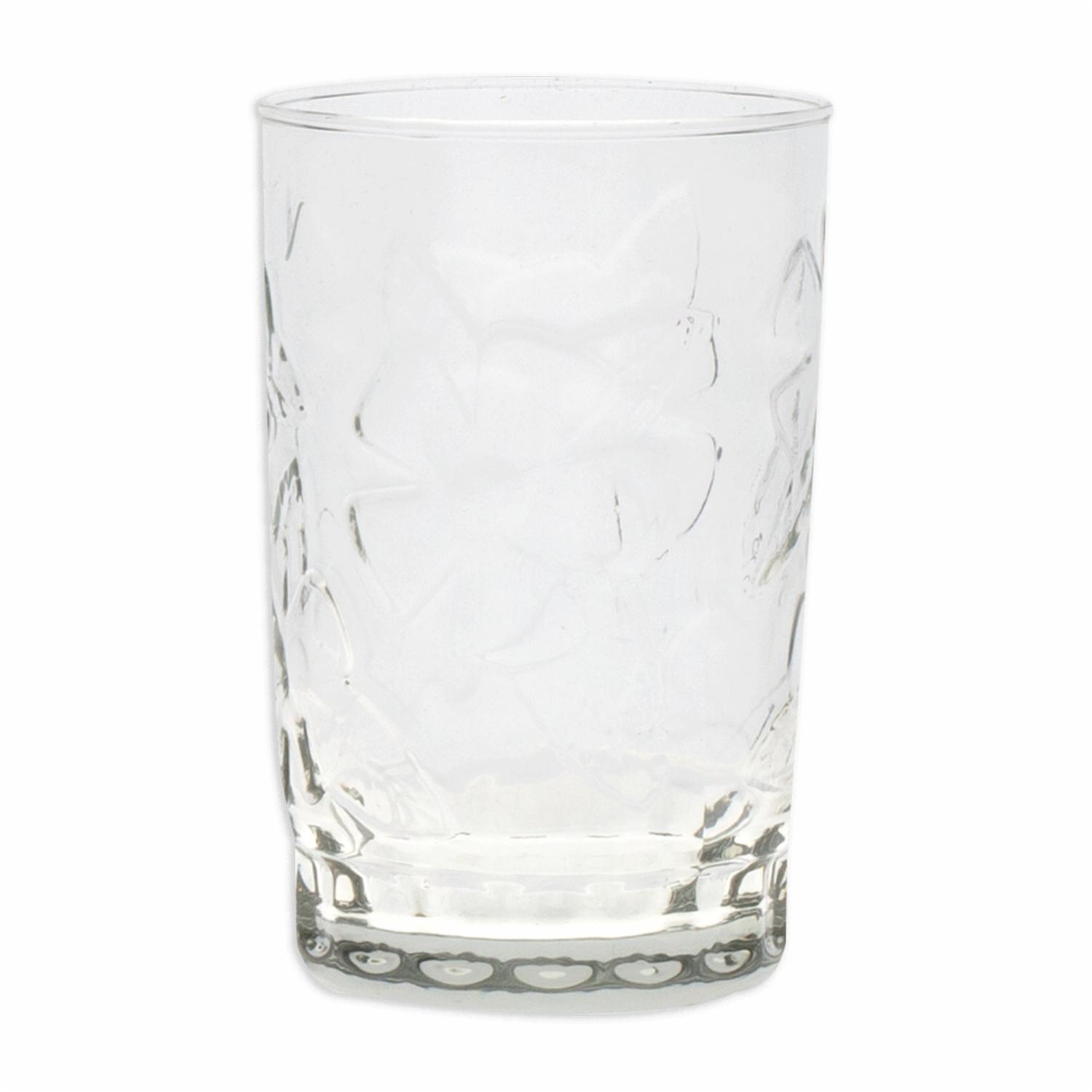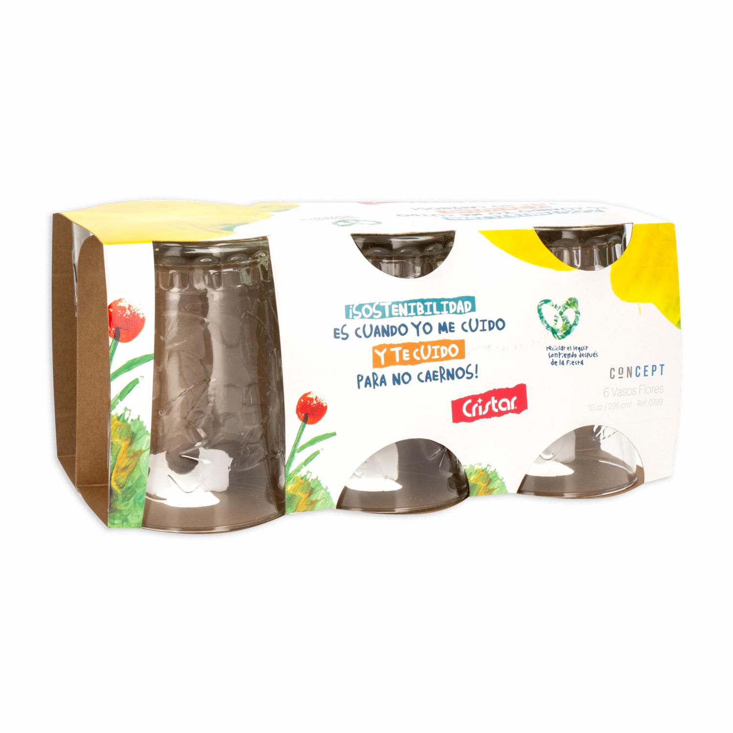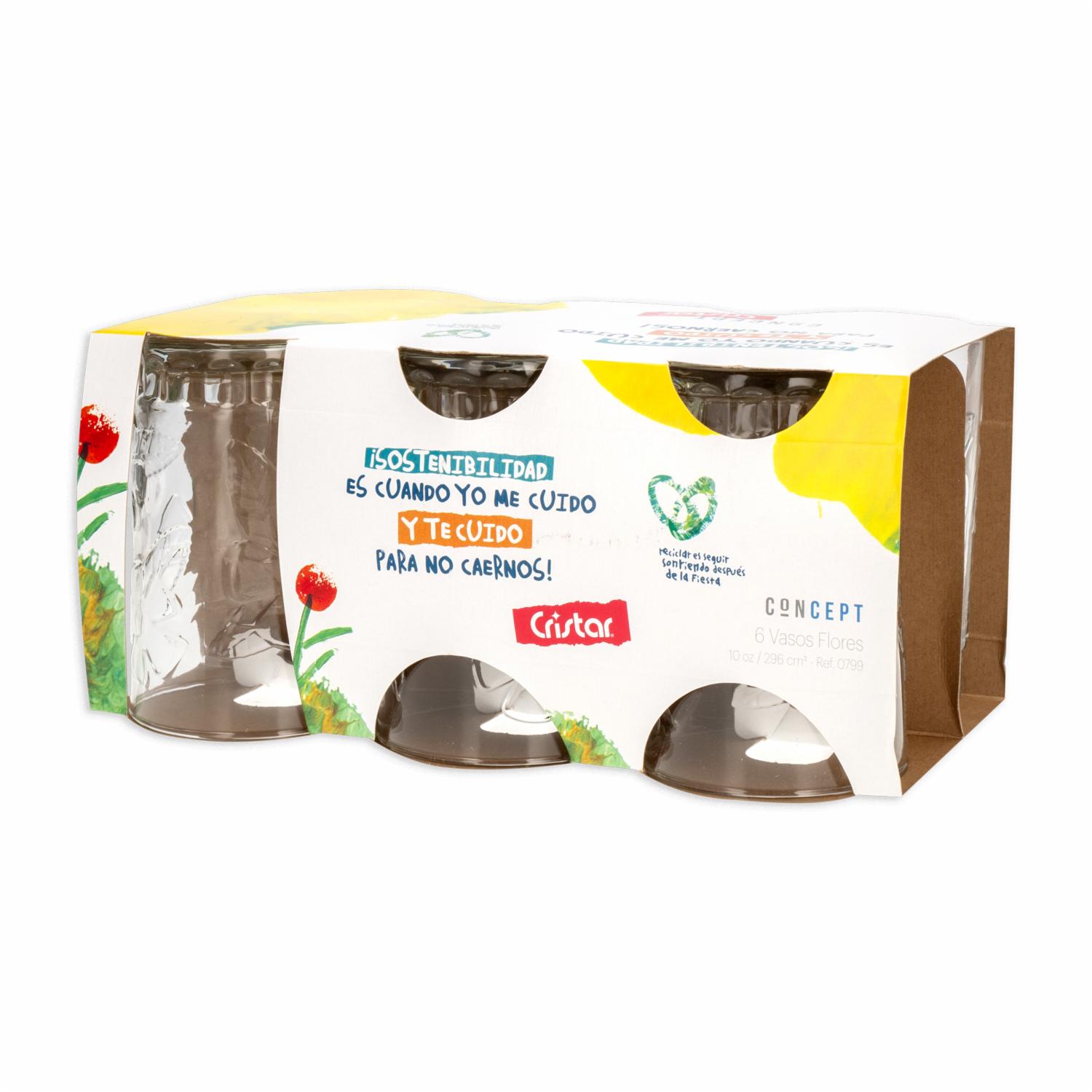 • Características: - Fabricado en cristal - Capacidad: 295 ml por vaso - Set de 6 vasos - Diseño decorativo tipo Concept Flores - Ideal para jugos y bebidas frías - Alta claridad y resistencia - Apto para lavado a mano
