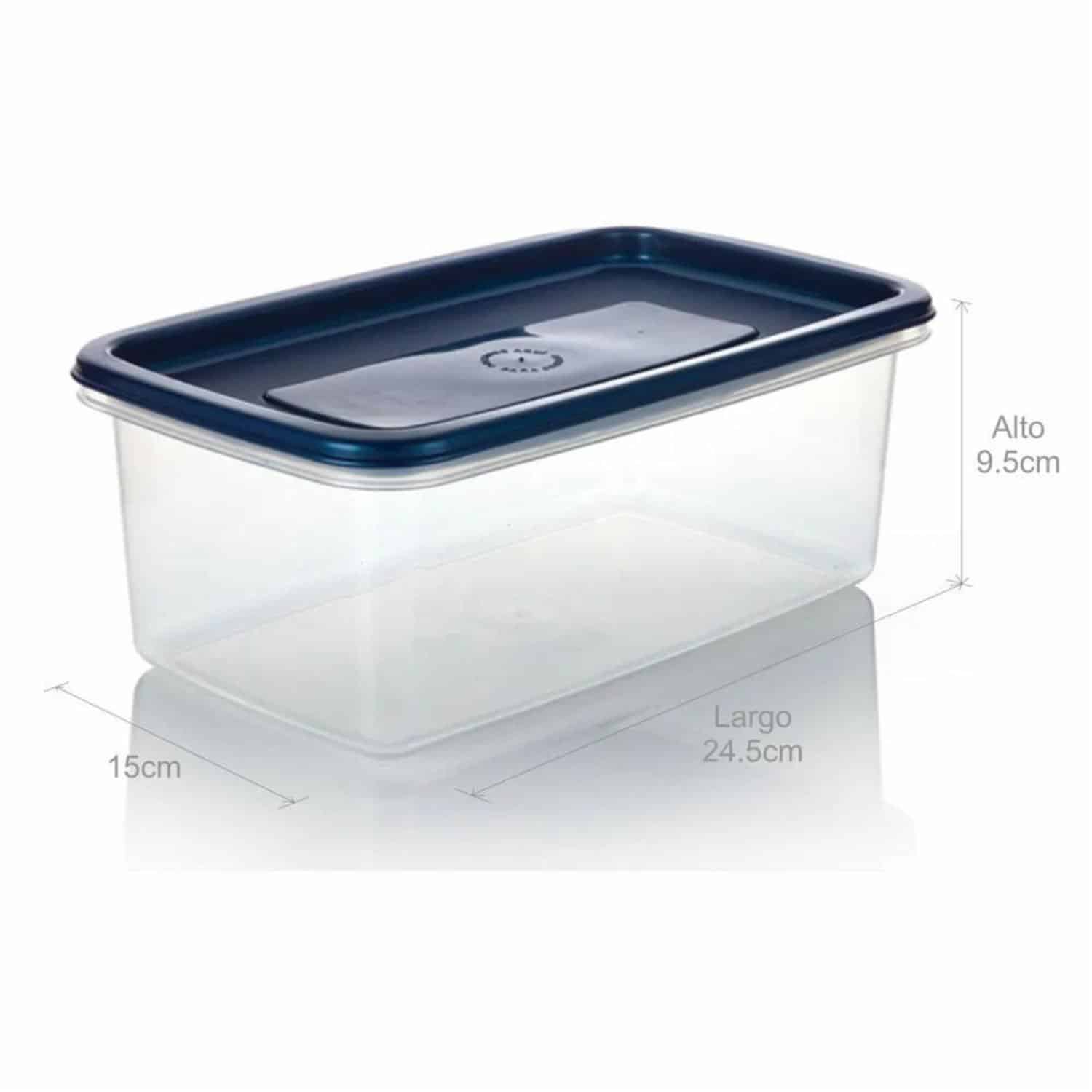 • Características: - Plástico resistente libre de BPA - Capacidad de 2 litros - Tapa de plástico con cierre a presión - Diseño rectangular que aprovecha mejor el espacio - Apto para microondas (sin tapa) y congelador - Fácil de apilar y limpiar Incluye: - Recipiente rectangular azul 2 litros