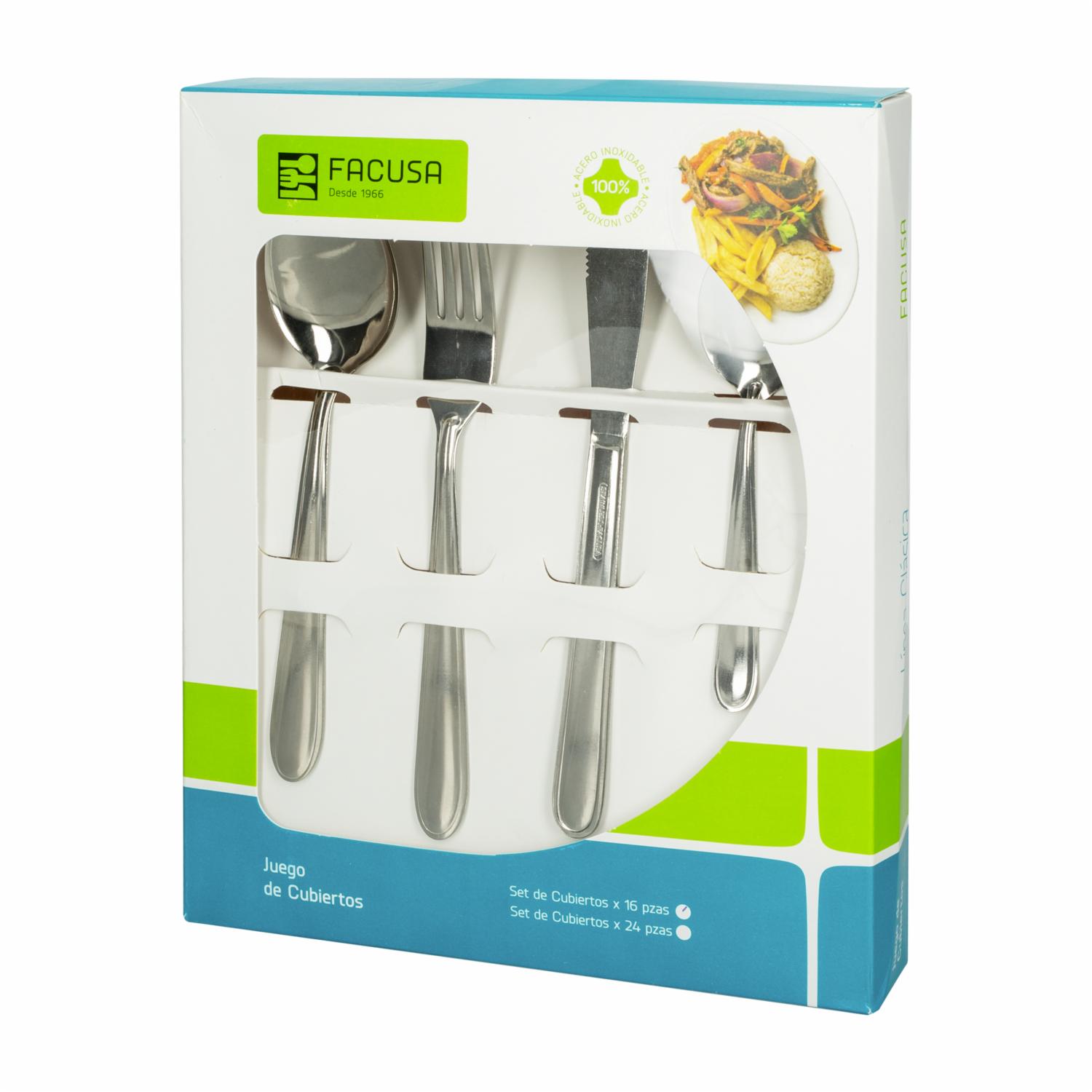 • Juego de Cubiertos Diseño Urban FACUSA 16 Piezas ofrece un diseño moderno y funcional para equipar tu mesa con estilo