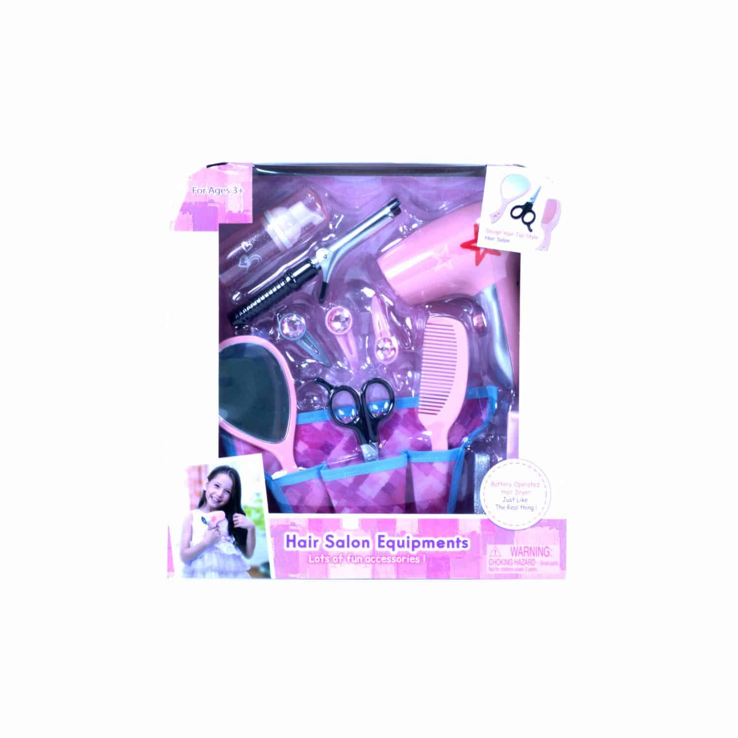 Graciosa colección de accesorios relacionados con la peluquería y la belleza. Todos ellos de máxima calidad, incluyendo el maletín. El secador funciona con pilas no incluidas