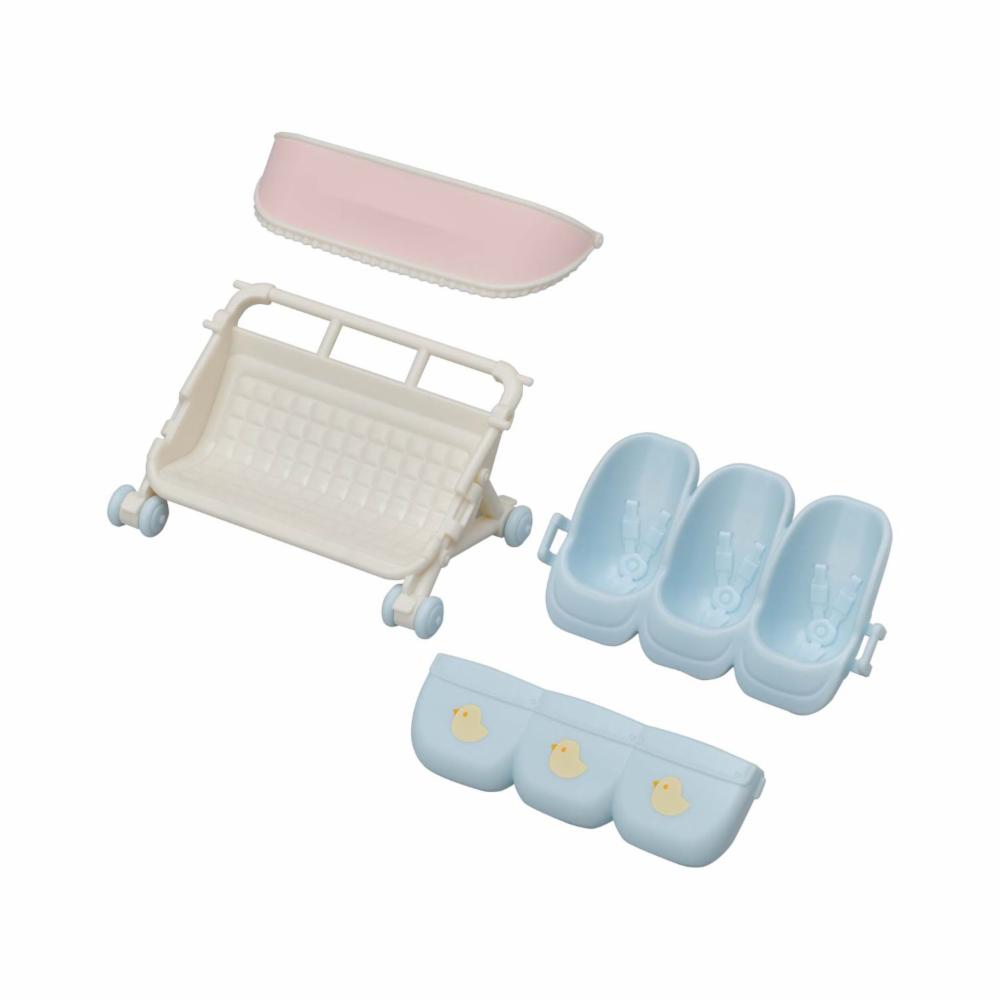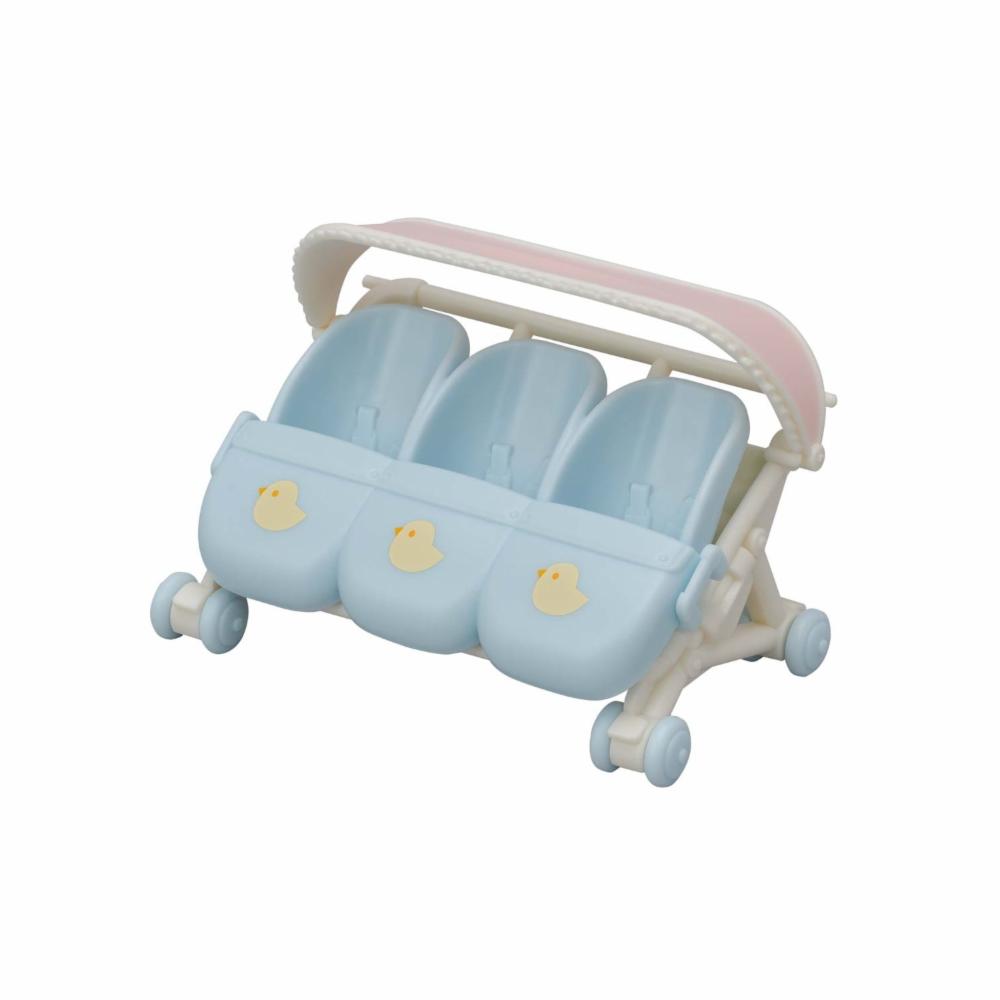 ¡Saca a pasear a tus trillizos! Todos en la Aldea Sylvanian están deseando conocerlos. El Carrito de Trillizos es una silla de paseo para las figuras de trillizos bebés. Al quitar el asiento, se puede hacer espacio para convertirlo en sillita gemelar