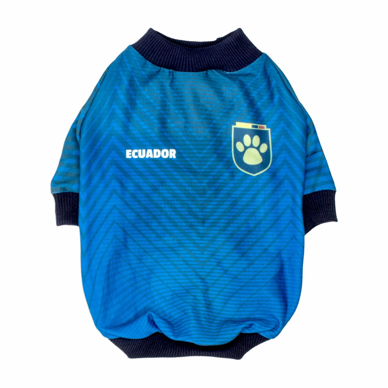 • El vibrante color azul, inspirado en los colores distintivos del equipo nacional, se complementa con el escudo característico de la selección ecuatoriana, asegurando que tu mascota luzca con estilo y orgullo en cualquier ocasión