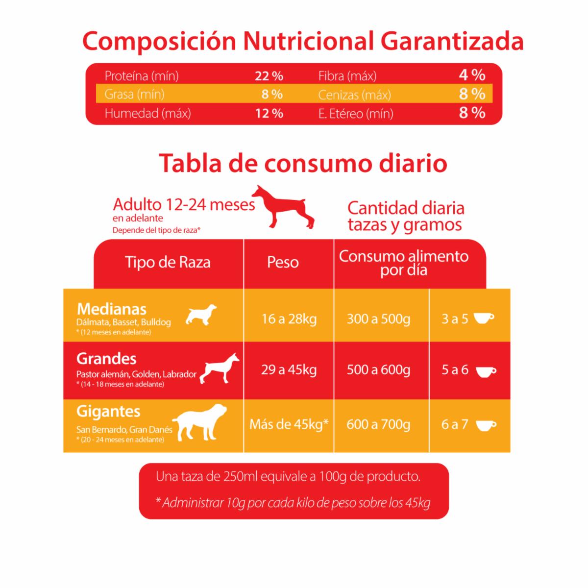Este alimento está diseñado cuidadosamente para brindar los nutrientes esenciales que los perros adultos necesitan para mantener su energía, salud y bienestar. Incluyen proteínas de alta calidad, vitaminas, minerales y otros ingredientes clave que apoyan la salud de la piel, el pelaje, la digestión y el sistema inmunológico