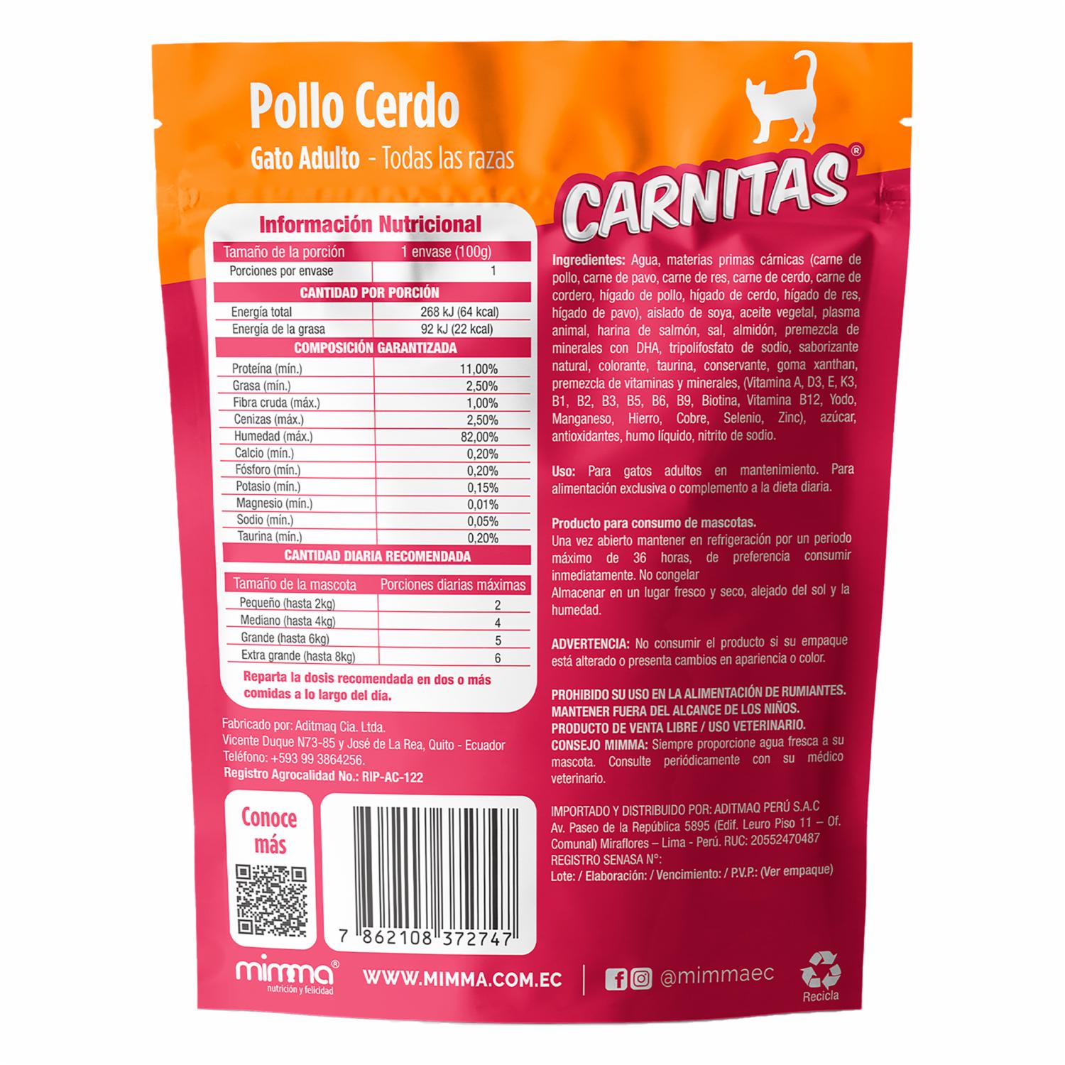 Snack Para Gatos Adultos Todas Las Razas Trocitos En Salsa Pollo Cerdo CARNITAS 85 G