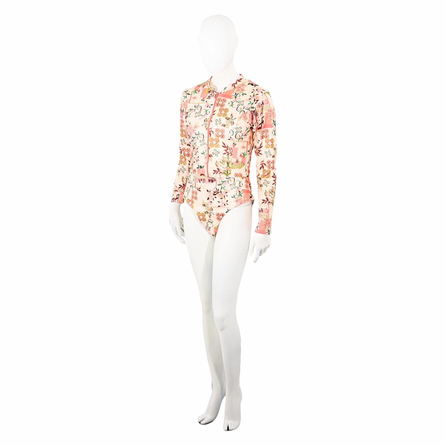 Con su diseño de mangas largas y cuello redondo, este traje de baño estampado brinda protección y estilo. Ideal para largas jornadas bajo el sol
