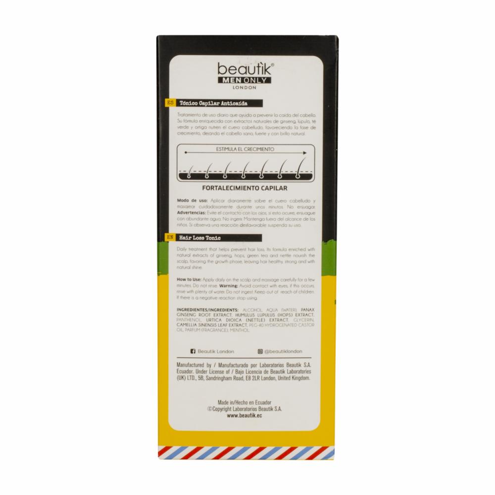 • El tratamiento capilar anticaída BEAUTIK MEN ONLY está formulado para abordar la caída del cabello y mejorar la salud del cuero cabelludo