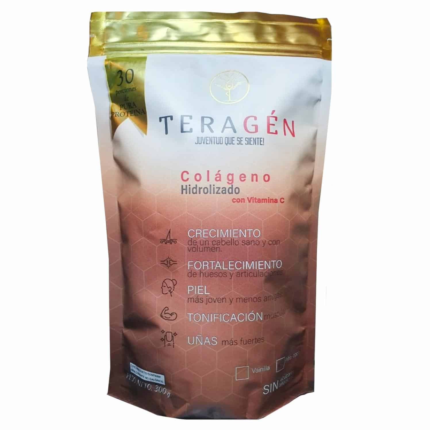 • El producto Colageno Hidrolizado con Vitamina C de TERAGÉN tiene las siguientes propiedades principales:. - Ayuda a mantener la salud de la piel, cabello y uñas. - Contribuye a la formación de colágeno, proteína esencial para mantener la estructura y elasticidad de los tejidos del cuerpo