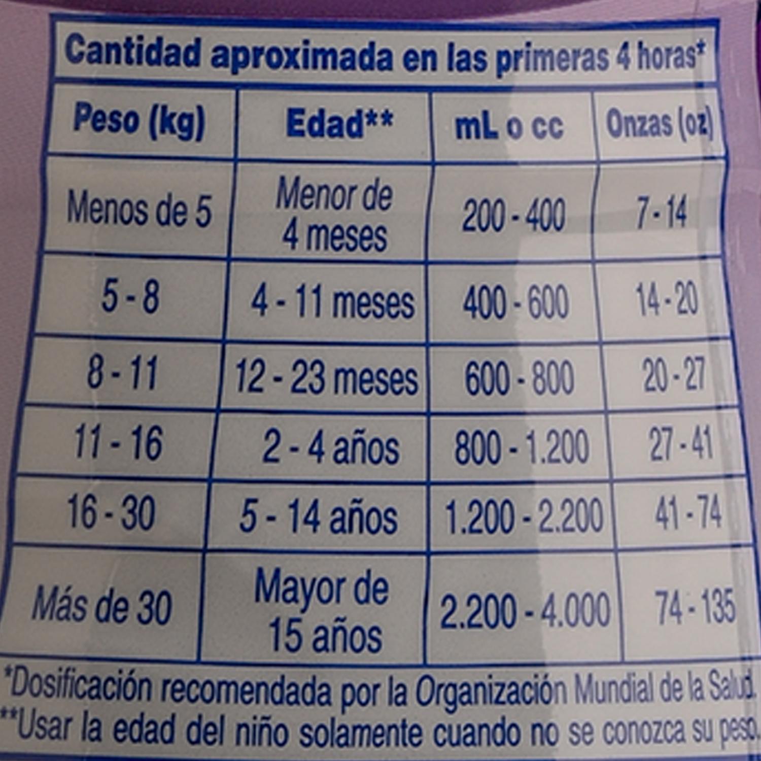 - Sabor a uva. - Contiene 75 mEq de electrolitos. - Contiene zinc. - Ayuda a rehidratar el cuerpo en casos de deshidratación leve o moderada. - Puede ser utilizado por personas de todas las edades, incluyendo niños y adultos