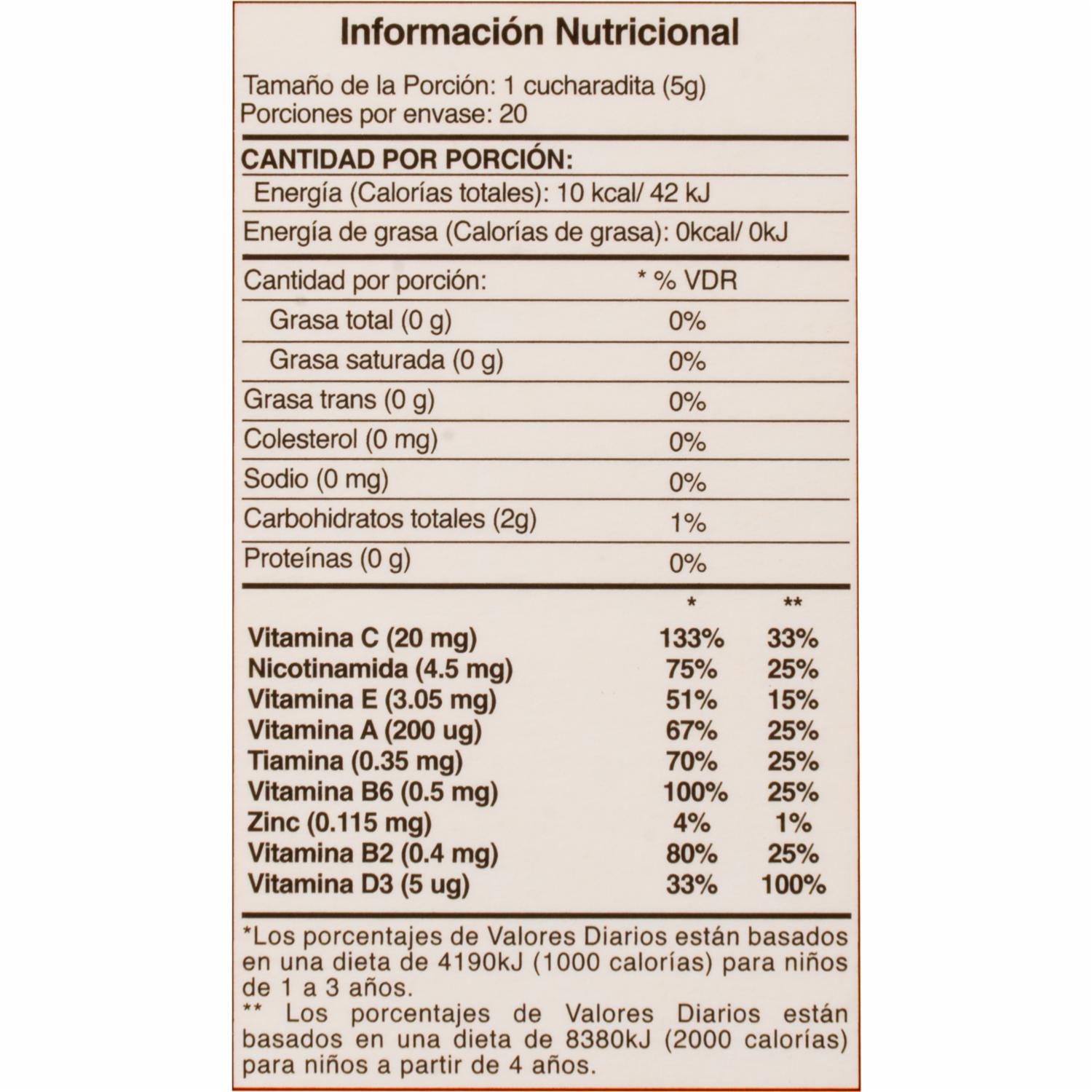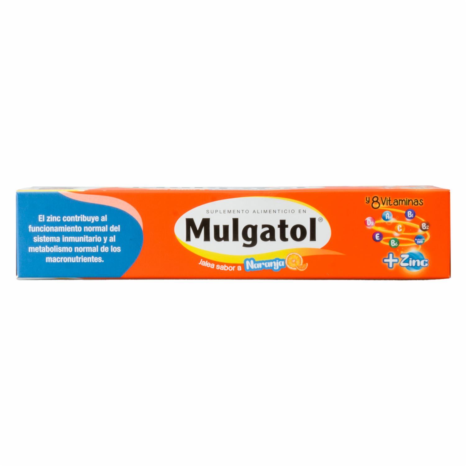 • Mulgatol sabor naranja contiene 8 vitaminas esenciales: A, B1, B2, B3, B6, C, D3, E