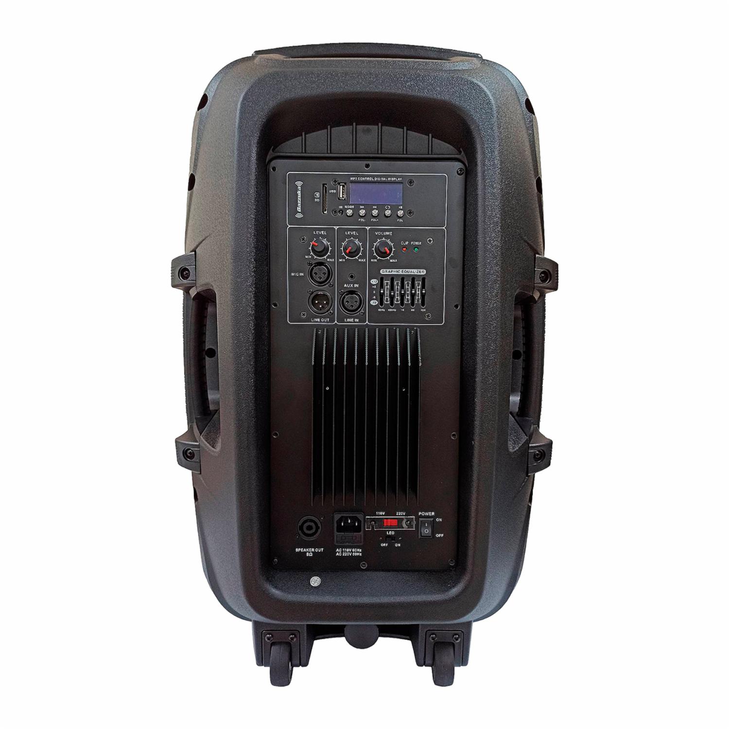 • El parlante amplificado de la marca Bazzuka dispone de múltiples puertos para conectar tus dispositivos, junto con una impresionante potencia de 50.000 vatios. Su diseño incluye cómodas agarraderas y ruedas para facilitar su transporte. Además, este modelo viene con un micrófono alámbrico, ideal para darle un toque único