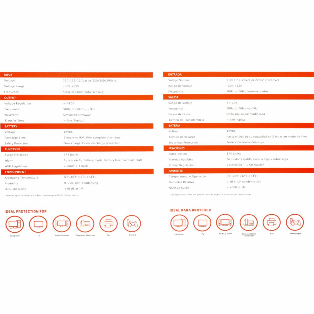 • Funciones - Sobretensión: 175 Joules - Alarmas Audibles: En modo respaldo, batería baja y sobrecarga - Voltaje Regulación: 2 Elevación + 1 Atenuación